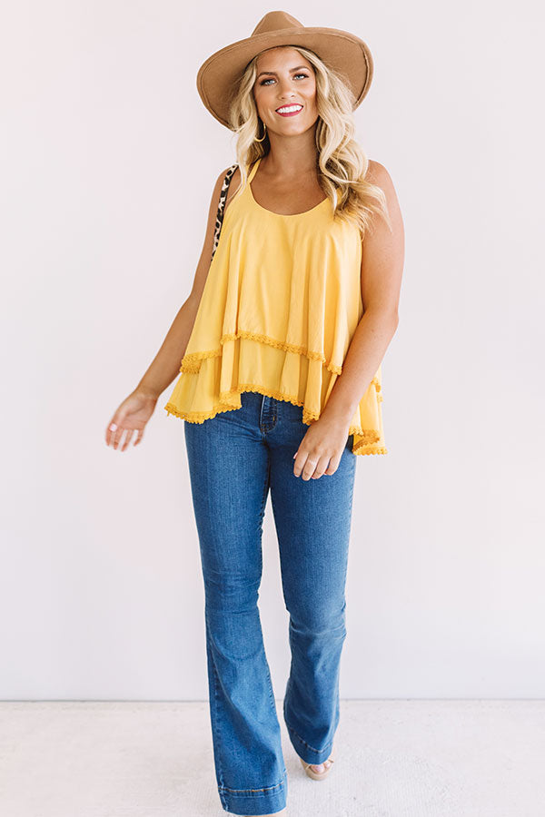We think the only BS you need in your life is beach and sunshine, so put this golden honey tank featuring a rounded neckline, double spaghetti straps, a criss cross back, and ruffled tiers with pom pom hemlines, on with some flared jeans and a neutral platform heel and faux suede hat for a "Sand Tropez" vacay look! OR pair this bright piece with some distressed white shorts, "The Zara Sandal in Yellow," and our "Wanna Dance All Night Tassel Earrings in Purple" for an adorable game day outfit! Measurements