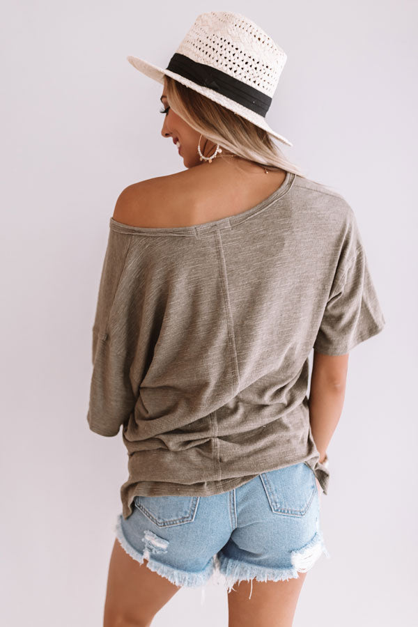 The sage "Sandy Shores" boyfriend tee is a key piece your closet has been craving with its short sleeves, a v-neck that can be worn off one shoulder, a loose fit silhouette, and two side slits on the high/low hem! We have styled this basic top with light wash distressed shorts, a neutral wedge, and a straw hat and tote, but it can also be paired with "The Everleigh High Waist Flares in Charcoal" and "The June Bootie in Sage" for an adorable outfit that is sure to be a year round fave! Measurements