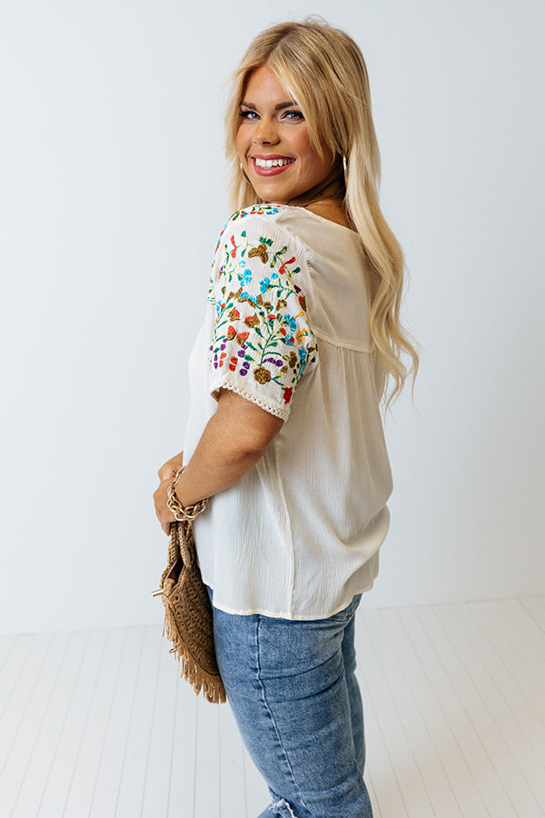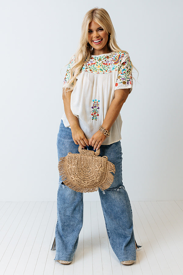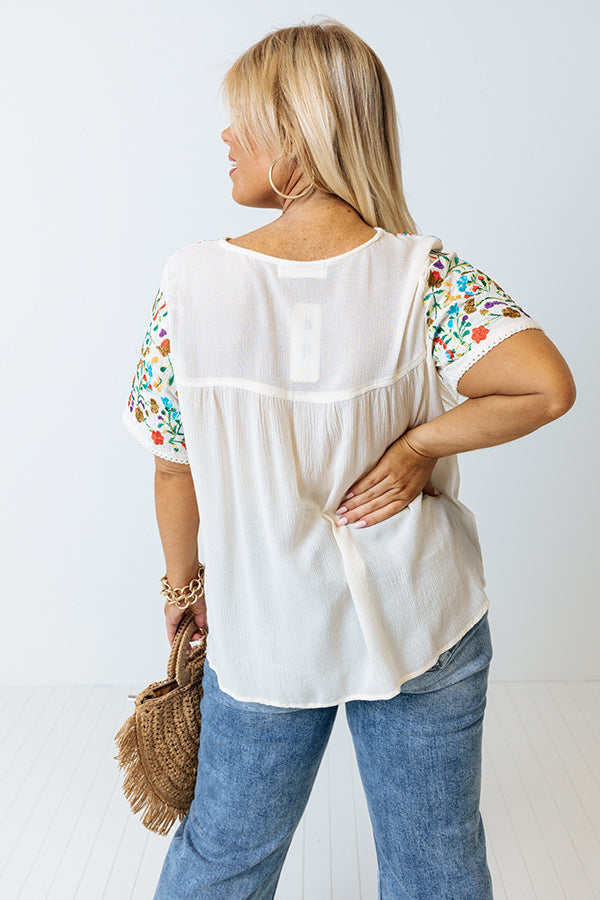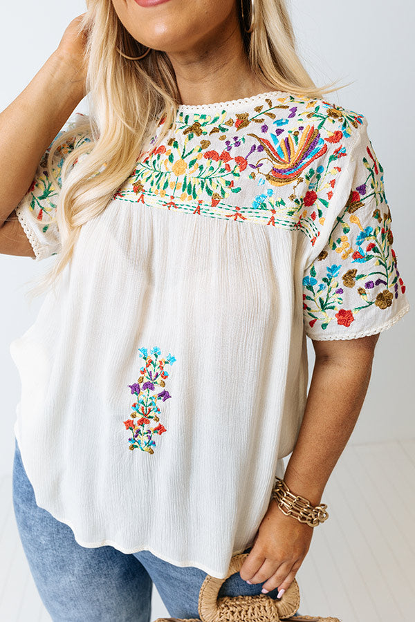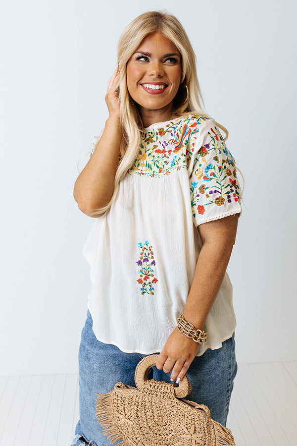 Brighten up your summer wardrobe with our adorable cream colored plus size 'SanFran Sunshine' top featuring lightweight breeze material patterned with colorful floral embroidery, a high rounded neckline, short loose sleeves, and a relaxed silhouette that falls into a straight hemline!