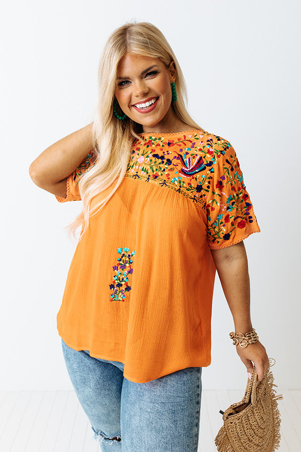 Brighten up your summer wardrobe with our adorable orange plus size 'SanFran Sunshine' top featuring lightweight breeze material patterned with colorful floral embroidery, a high rounded neckline, short loose sleeves, and a relaxed silhouette that falls into a straight hemline!