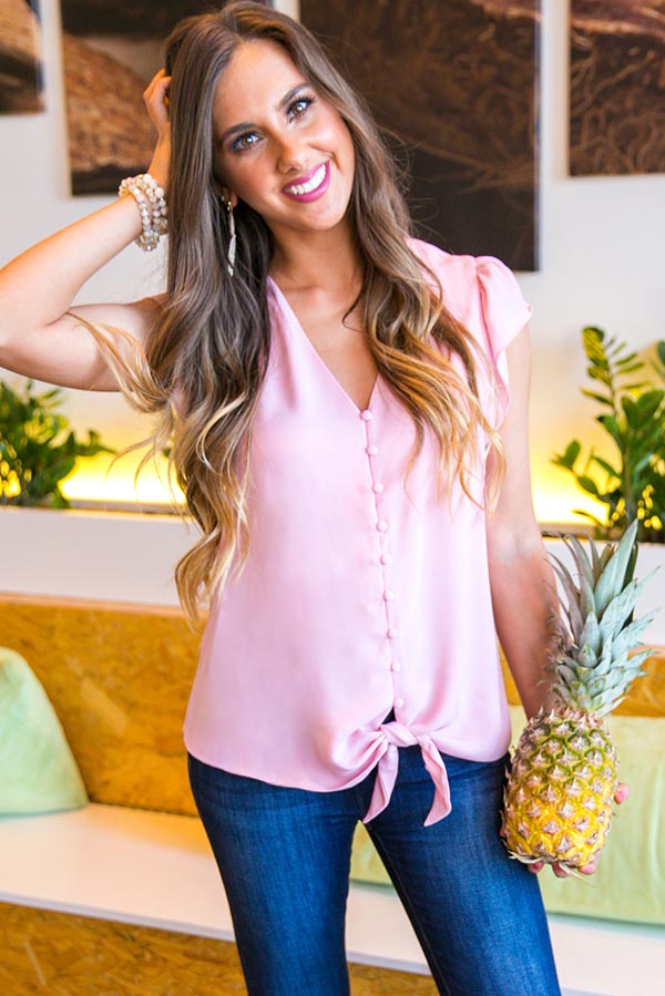 This sweet chiffon shift top is absolutely to tie for! With a tasteful v-cut neckline, short flutter sleeves, breezy button-down bodice & trendy tie-bottom hem you will have this versatile top on repeat all season long.