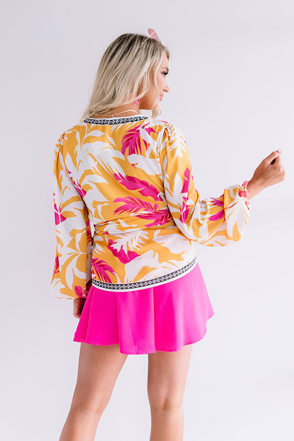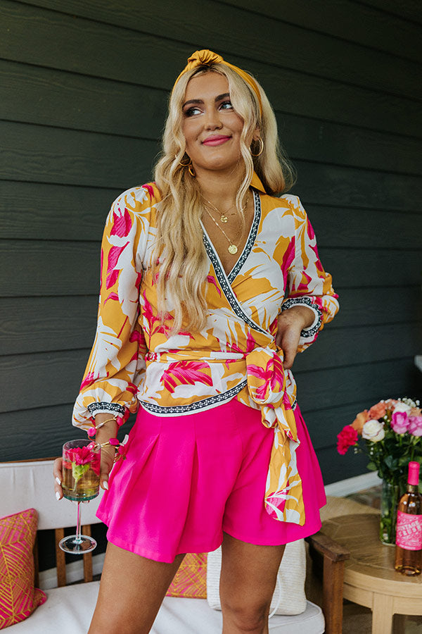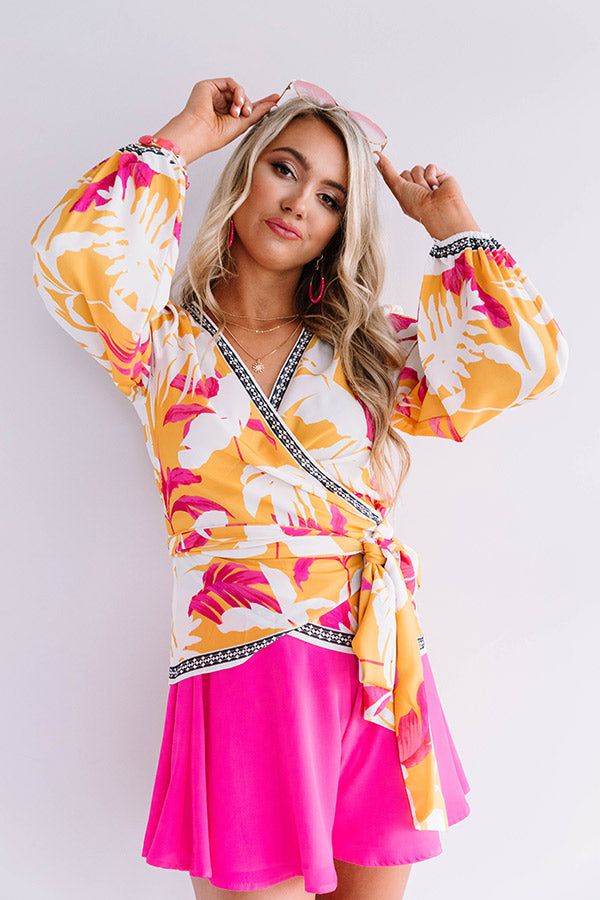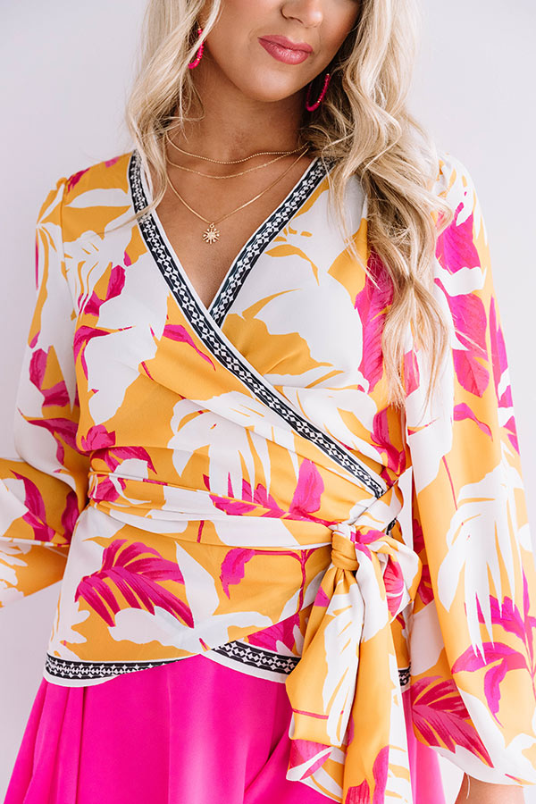 You are sure to turn heads in our vibrant 'Sangria Summer top featuring lightweight material patterned with an intricate orange and hot pink hued floral print and abstract black and white trim detailing, a wrapped bodice with a tie closure, a v-cut neckline, long loose bubble sleeves with fitted elastic cuffs, and a figure flattering silhouette that falls into an uneven hemline! Measurements