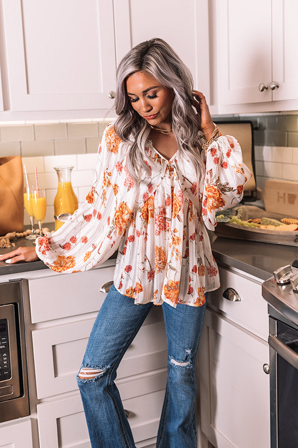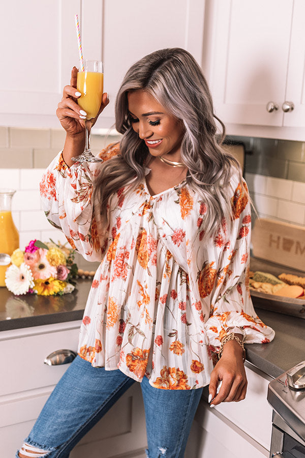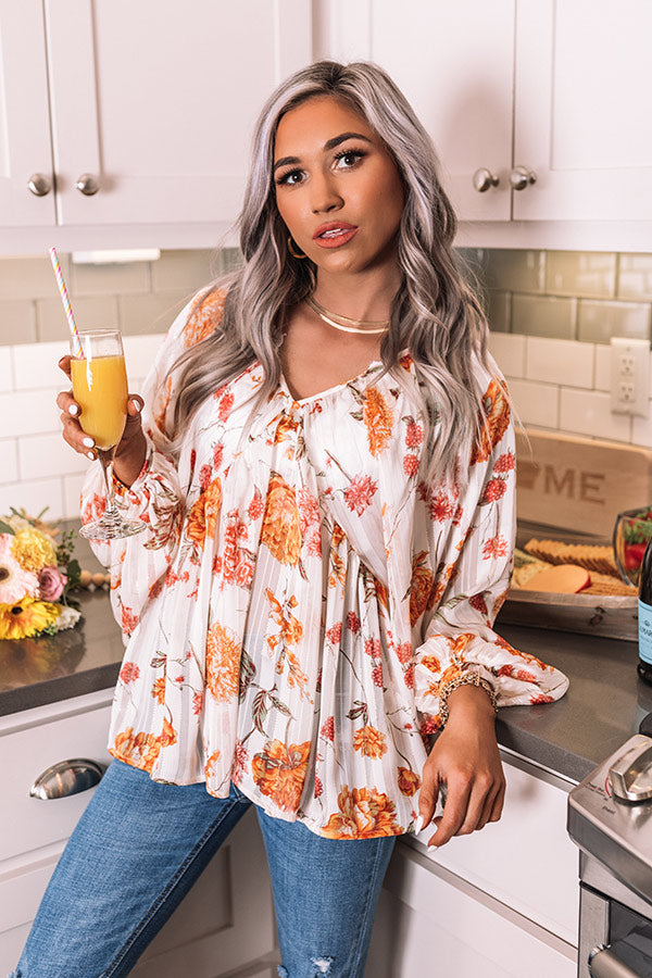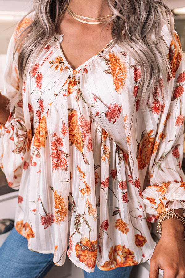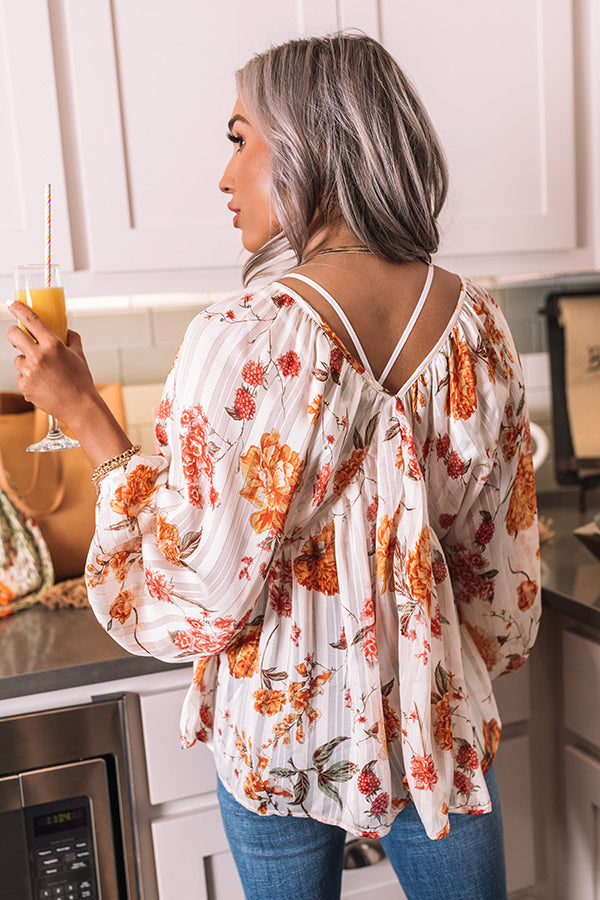 Transition from season to season in style with our cute white 'Sangria Sunrise' top featuring lightweight breezy material patterned with large yellow/orange and dark pink hued floral print, subtle vertical accent stripes, a v-cut neckline and upper back, long loose sleeves with fitted cuffs, and a draped silhouette that falls into a rounded hemline! Measurements