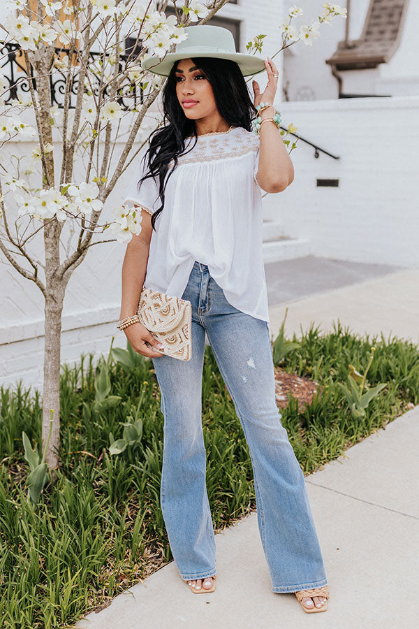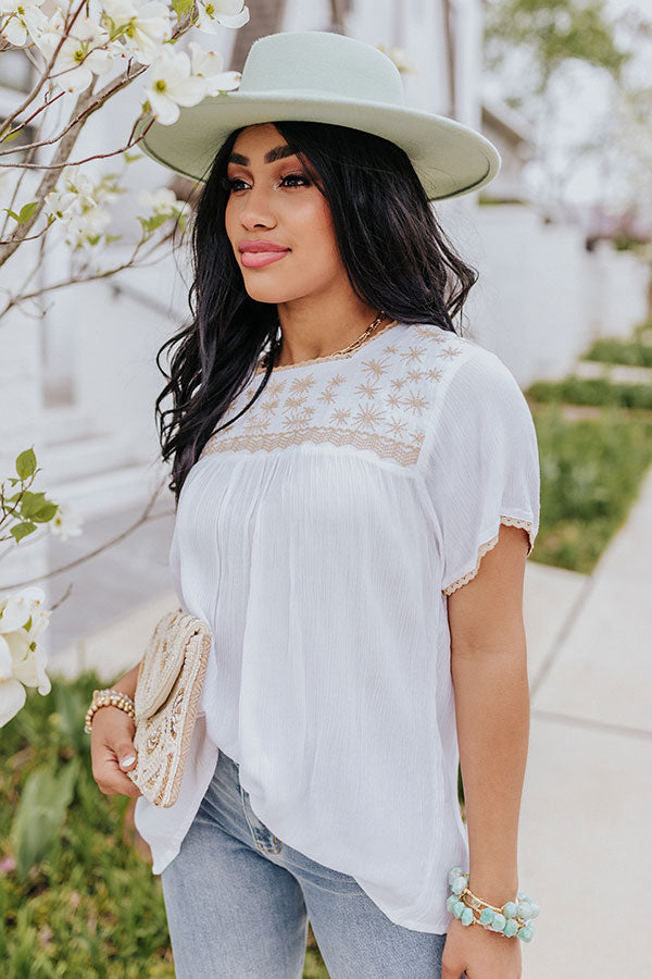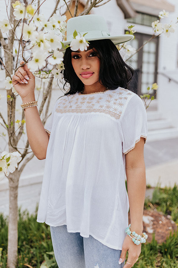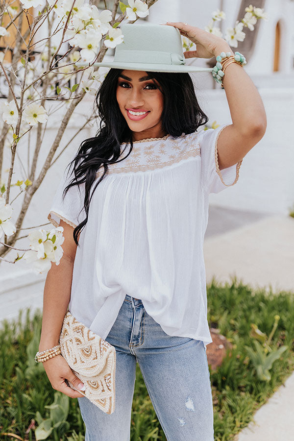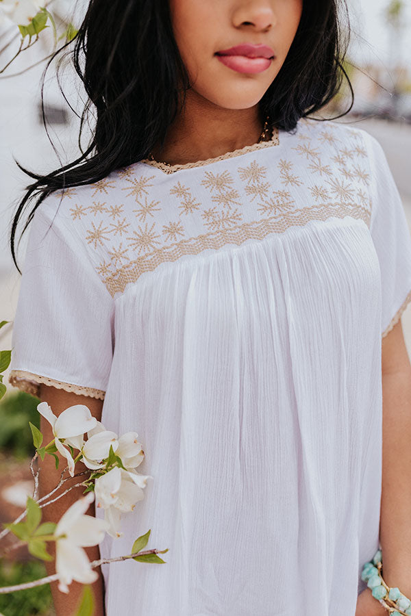 Sway into style with this chic white featuring lightweight flowy material with intricate tan hued embroidered detailing across the bodice and shoulders, short loose sleeves, a high square neckline and upper back, dainty lace trim detailing, and a relaxed silhouette hat falls into an uneven hemline! Measurements