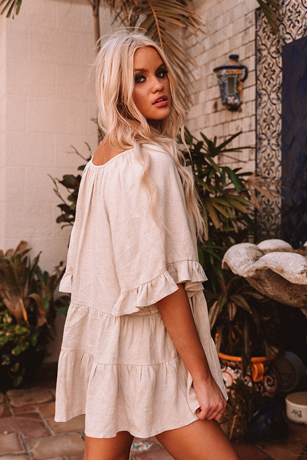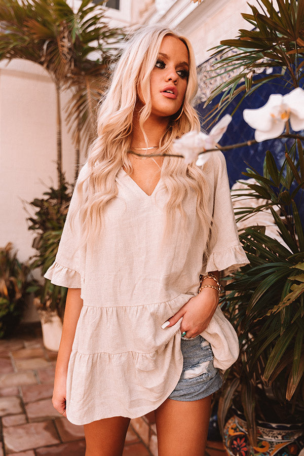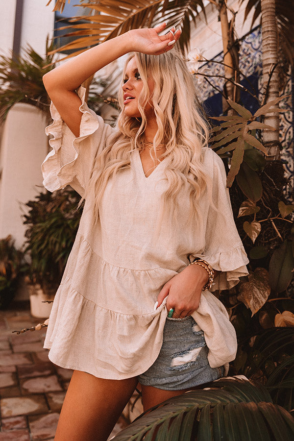 Take on summer like a true fashionista with our charming birch colored 'Santa Clara Shift Top' featuring lightweight material, a rounded neckline with a v-notch accent, oversized half sleeves with ruffle trim cuffs, and a relaxed tiered silhouette that falls into an uneven hemline! Measurements