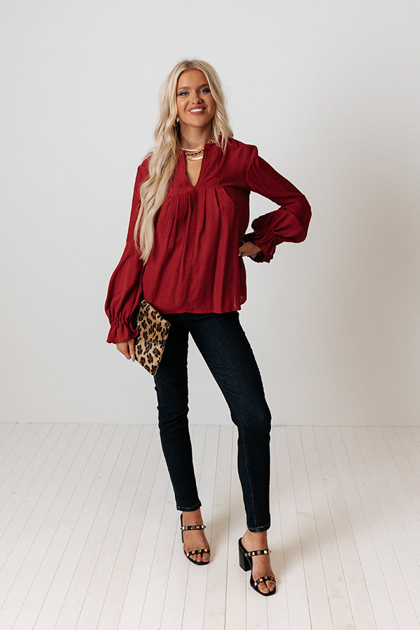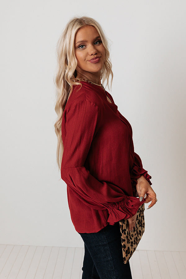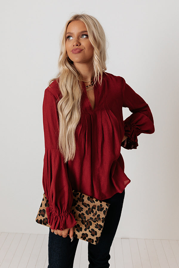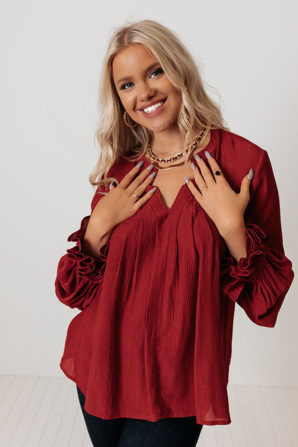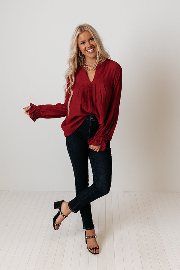 Stay chic in this classy wine colored shift top featuring lightweight breezy material, a v-cut neckline, long loose bishop sleeves with flared ruffle cuffs, and a relaxed silhouette that falls into a rounded hemline!