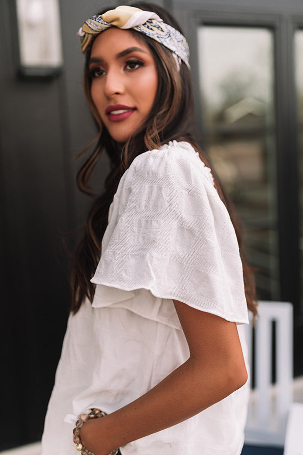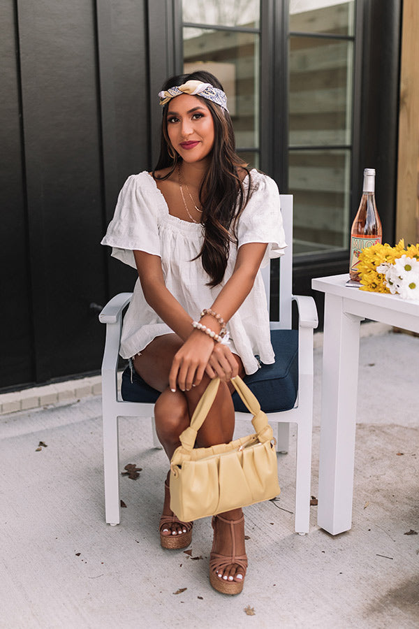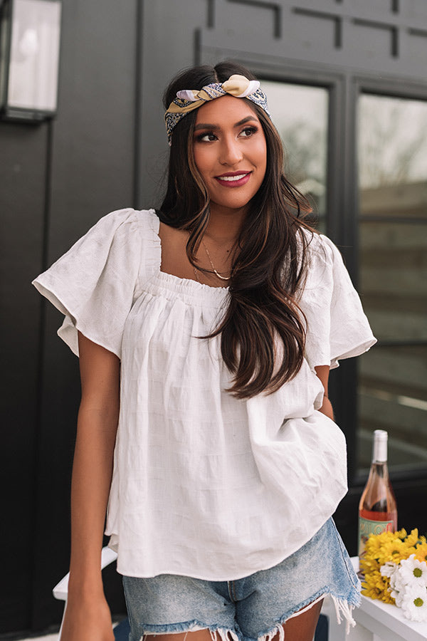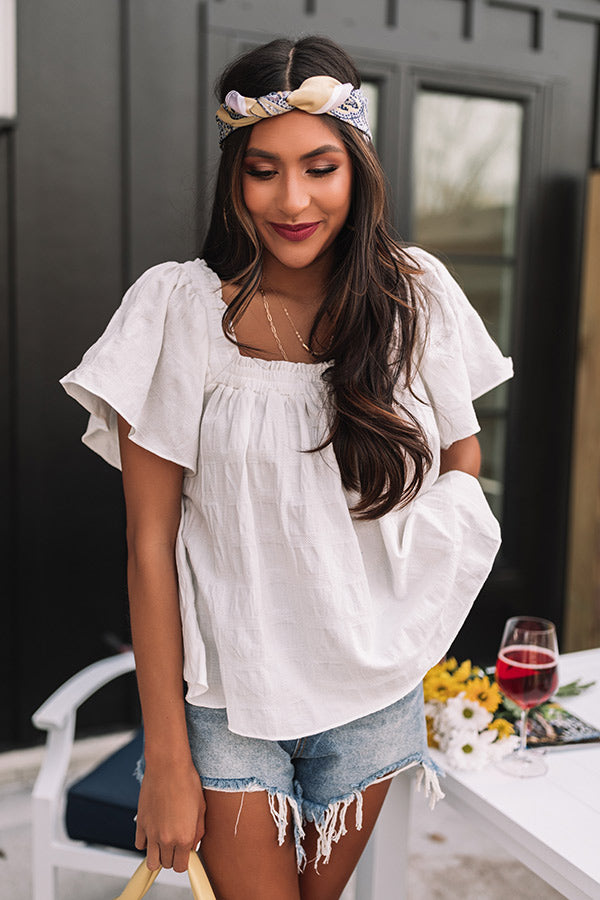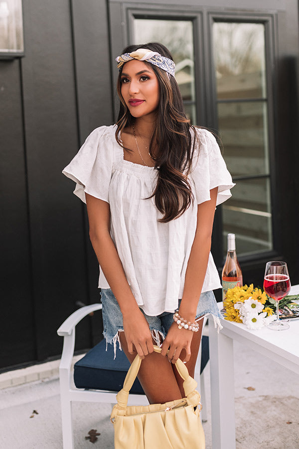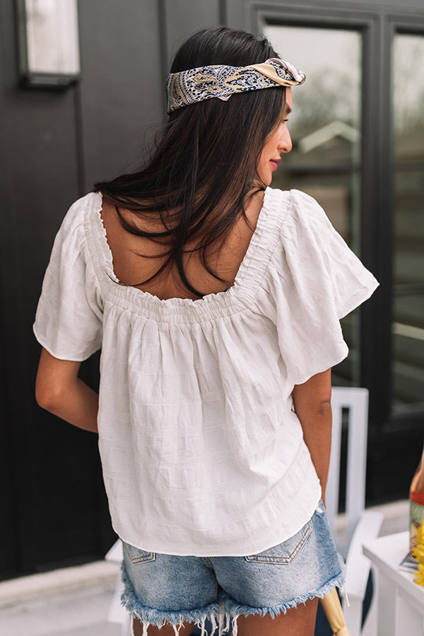 You are sure to look darling in our dainty white 'Santa Cruz Pier Top' featuring lightweight flowy material with square print texturing, a square neckline and upper back with smocked trim detailing, short oversized flowy sleeves, and a relaxed silhouette that falls into a rounded hemline!