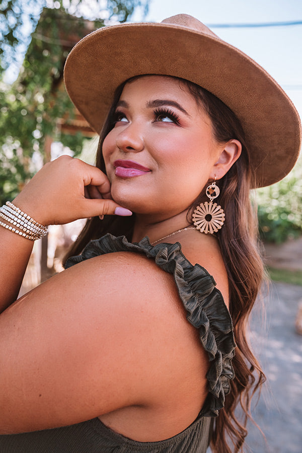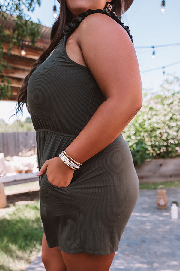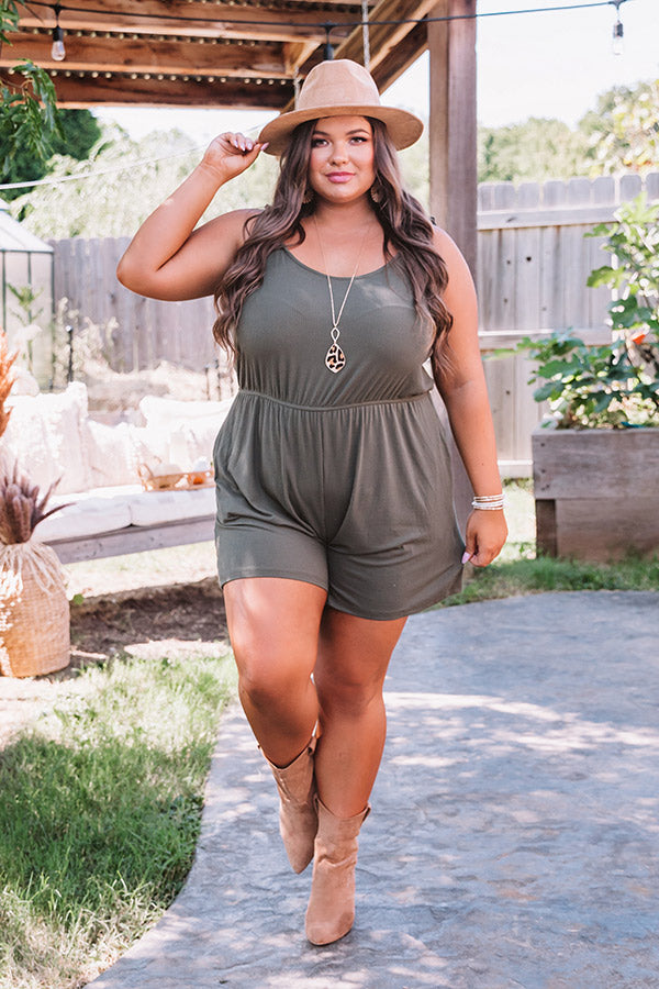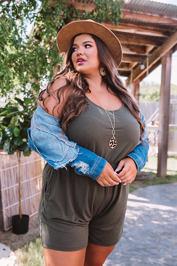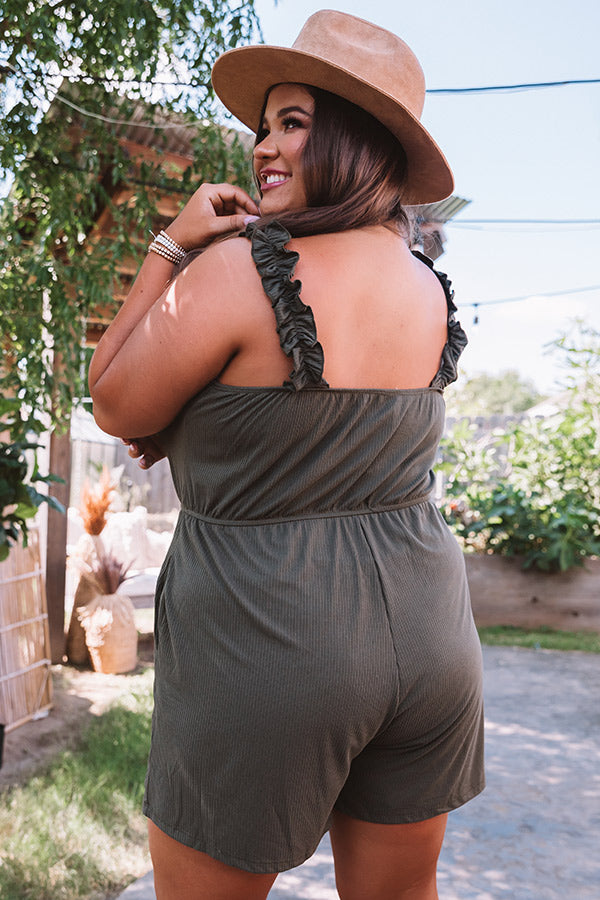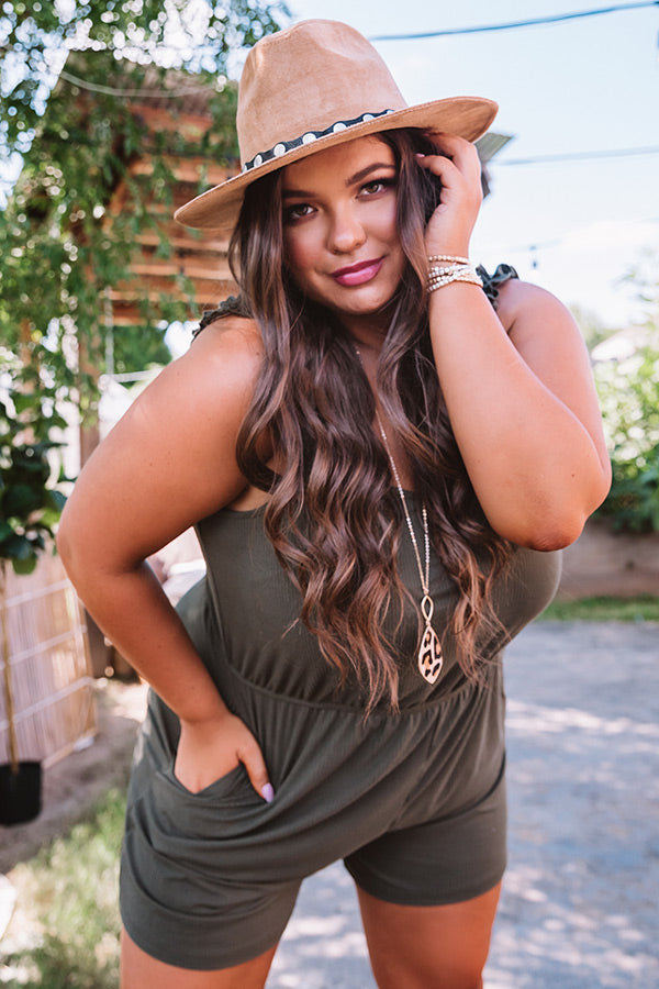 Plus Size - Slay all day in our adorable army green "Santa Fe Sunrise Romper" featuring soft lightweight material with subtle ribbed texturing, a scooped neckline, 2-inch ruffled sleeveless shoulder straps with a square upper back, a cinched waistline, accent side pockets, and a relaxed shorts silhouette that falls into straight upper-thigh length hemlines! We have layered this transitional piece under a jean jacket with a brown boot and faux suede hat, but you can also style it with "The Alba Wedge in Ivory" and our "Greenwich Village faux Leather Clutch in Ivory!" Measurements