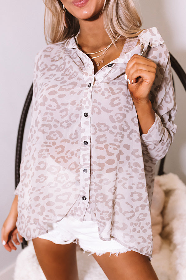 Let your wild side roam free in our adorable neutral hued "Santa Monica" top featuring lightweight breezy semi-sheer chiffon material patterned with a bold leopard print, a button down front with a collared neckline, long loose roll tab sleeves, and an ultra relaxed silhouette that falls into a rounded hemline! We have styled this darling piece with some matching statement earrings, distressed white shorts, a faux leather tote, and some neutral mule heels, but you can also wear it with some light wash flares, "The Bowen Wedge in Blush," and our "Sunshine Suite Sunnies in Blush!" Measurements