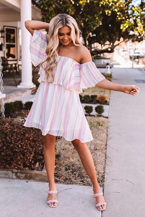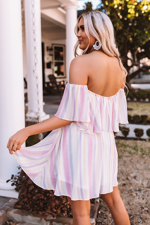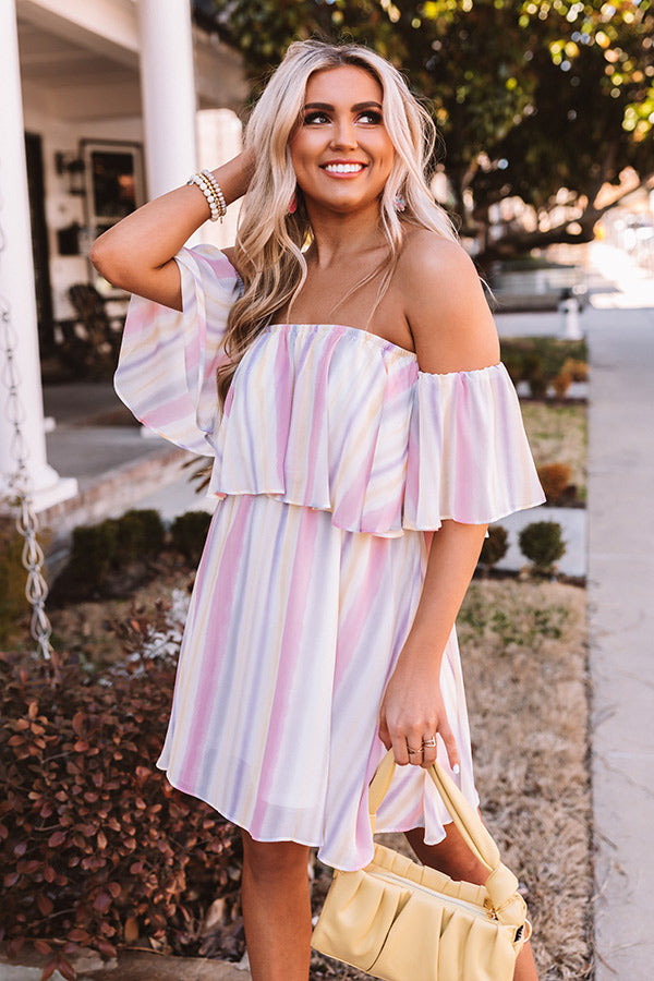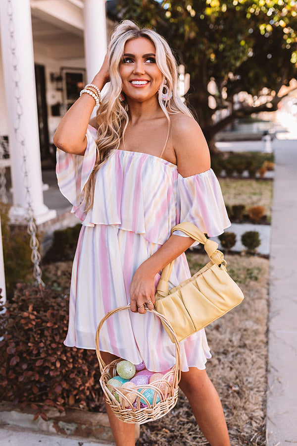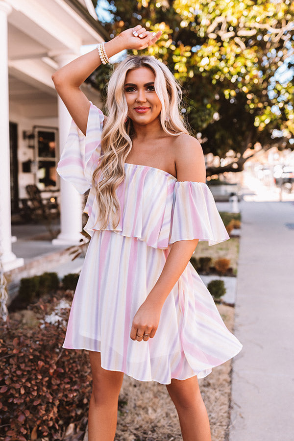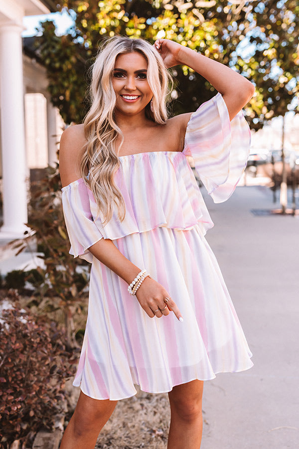 Kiss winter goodbye in this gorgeous shift dress featuring lightweight breezy material patterned with vertical pastel accent stripes, an elastic off shoulder fit with a straight neckline, an overlay bodice with flowy drop sleeves, and a relaxed silhouette that falls into an uneven mid-thigh length hemline!