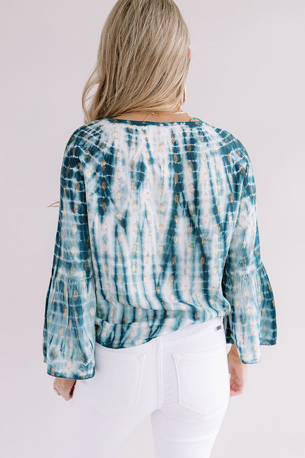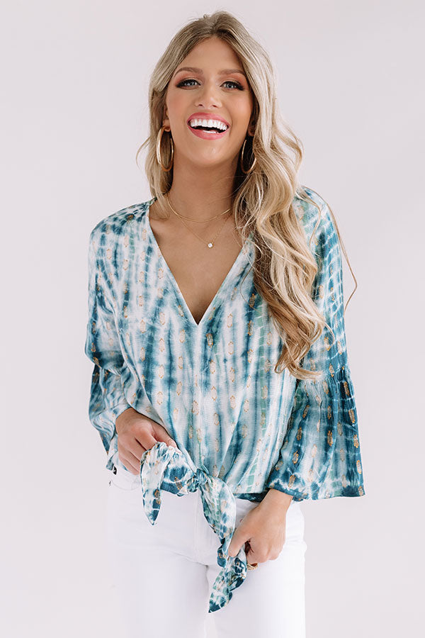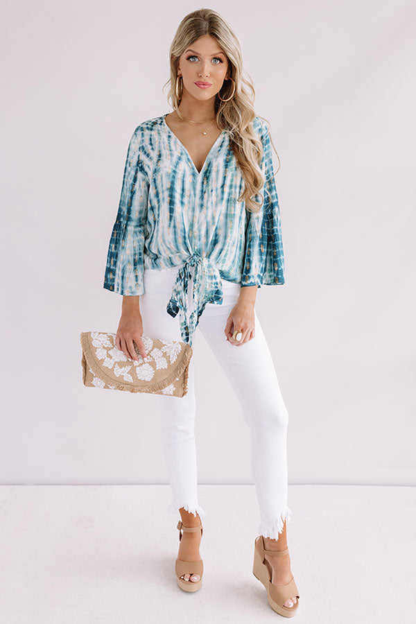 You will be as pretty as the "Santorini Sea" when you wear this stunning top featuring lightweight flowy white material patterned with navy tie dye, a v-cut neckline, loose 3/4-length sleeves with ultra flared cuffs, and an relaxed silhouette that falls into a front tie hemline! We have styled this cutie with frayed white skinnies, neutral wedges, and an embellished clutch, but you can also wear it with but you can also wear it with some distressed denim shorts, "The Lyla Heel in Gold," and our "Spread Your Wings Butterfly Hair Clip Set!" Measurements