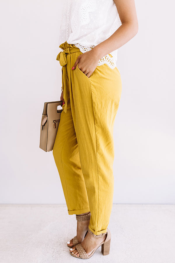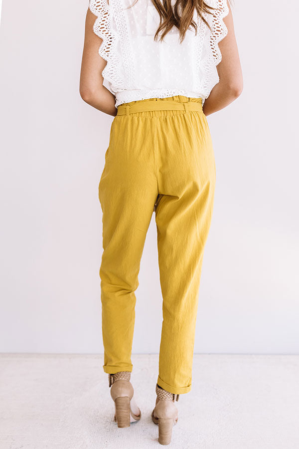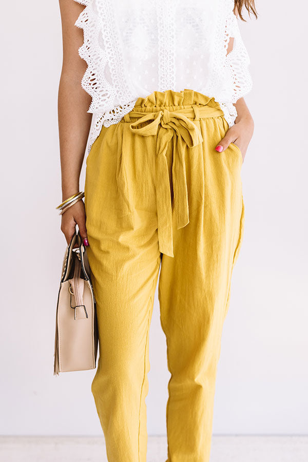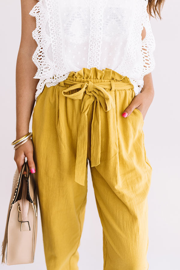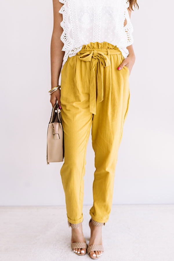 When you wear these pants, you will be saying "out of the way, I've got my sassy pants on today!" These mustard trousers feature a tie belt, elastic ruffled waistband, cuffed hems, and front pockets making these perfect for wearing in the Santorini sunshine! Measurements