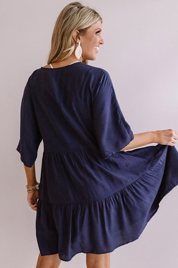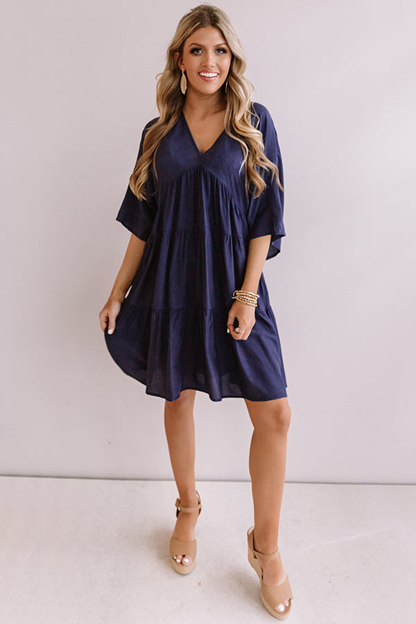 Our adorable navy colored "Santorini Swooning" dress is a classic piece you'll love with a feminine twist! It features lightweight material, a v-cut neckline, loose half sleeves, hidden side pockets, and an ultra relaxed tiered babydoll silhouette that falls into a straight mid-thigh length hemline! This cutie can be styled a variety of ways, like layered under a duster with a neutral wedges, or it can be worn with "The Tipton Espadrille in Grey," our "All Caught Up Headband in Grey,"' and our "Spanish Coast Fringe Crossbody in Grey!" Measurements