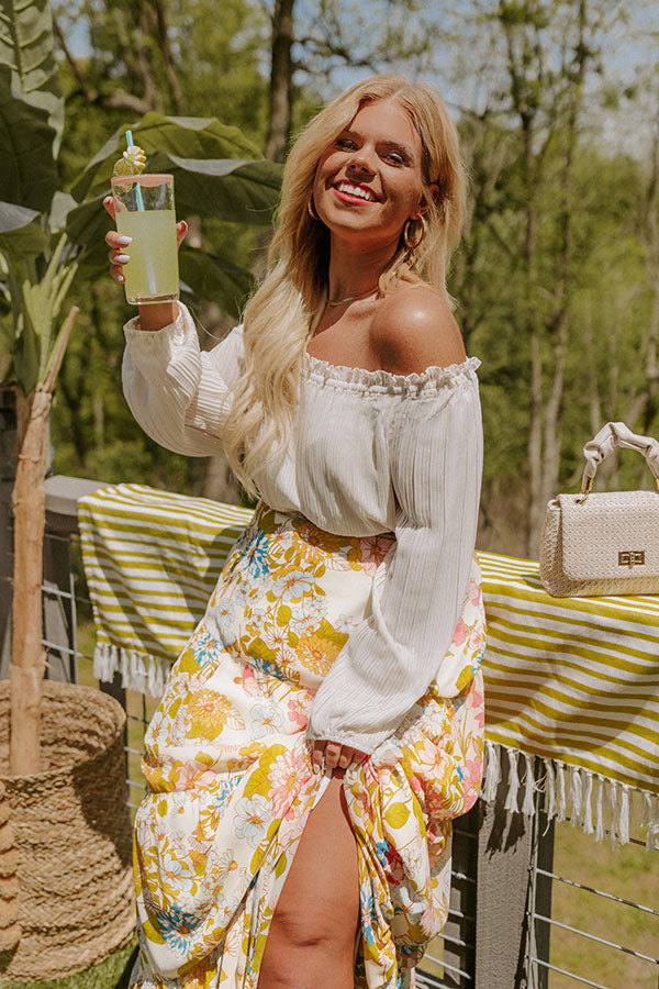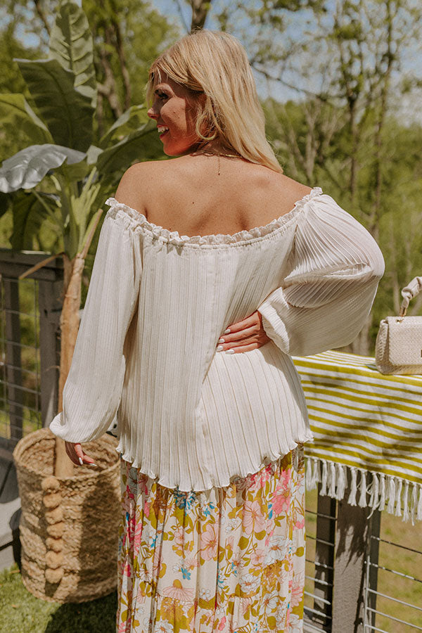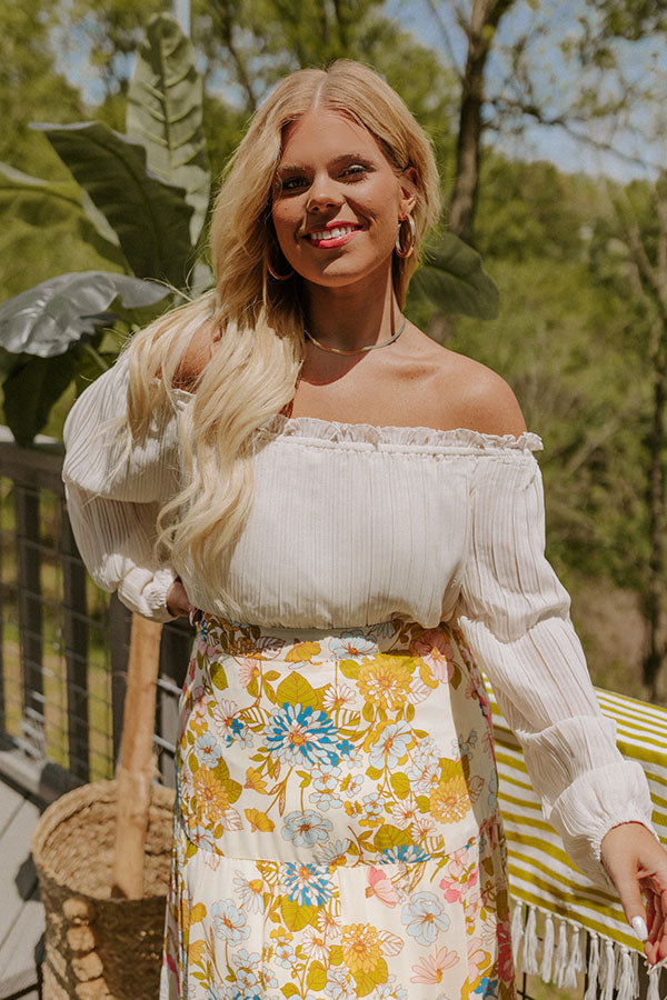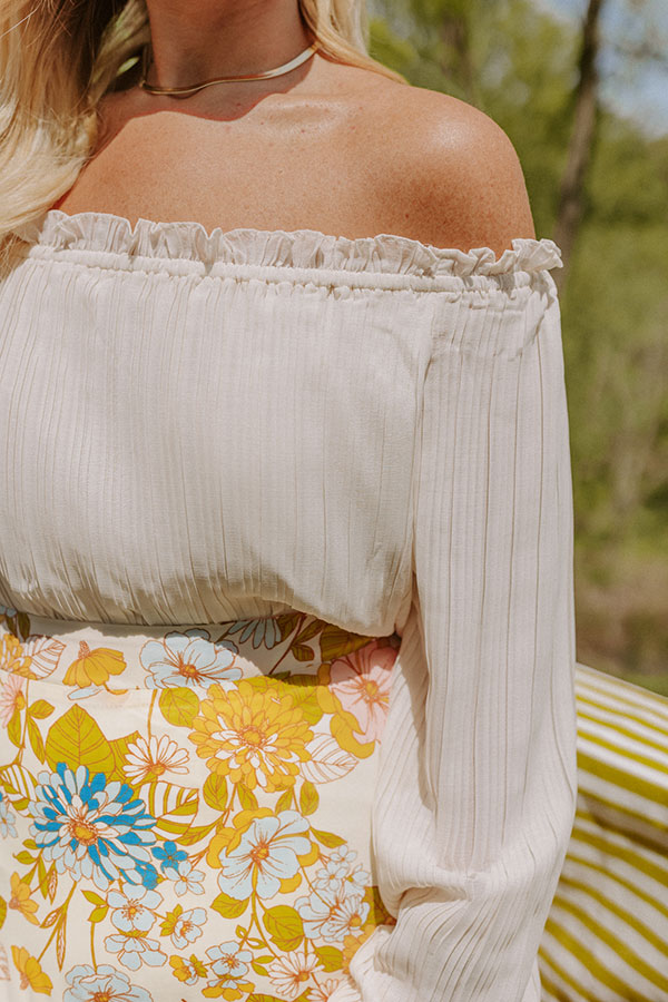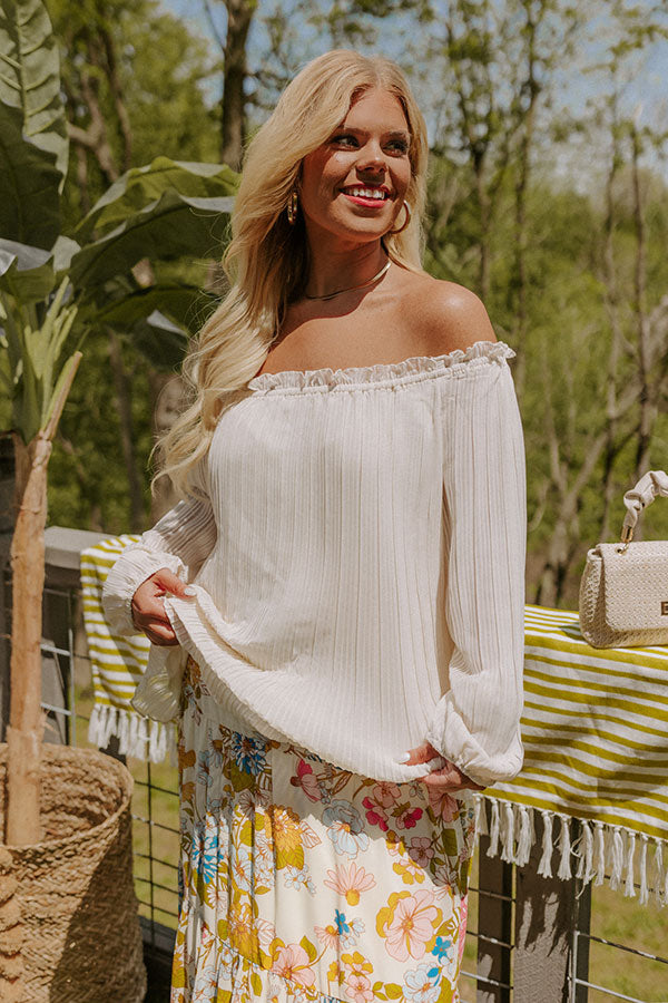 Complete your look in a sassy but sweet way with this darling cream colored plus size shift top featuring lightweight material with subtle vertical stripe texturing, an elastic off-shoulder neckline with ruffle trim detailing, long loose sleeves, and a relaxed silhouette that falls into a ruffled hemline! on products