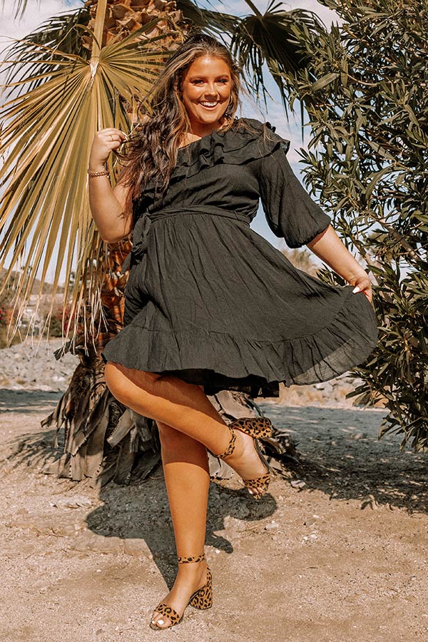 There is no better piece to wear when you are in a sassy mood than this flirty black dress featuring lightweight material, a diagonal one shoulder neckline with ruffled overlay trim and a single half sleeve, a cinched waistline with a tie belt, and a relaxed skirt silhouette that falls into a ruffled mid-thigh length hemline!