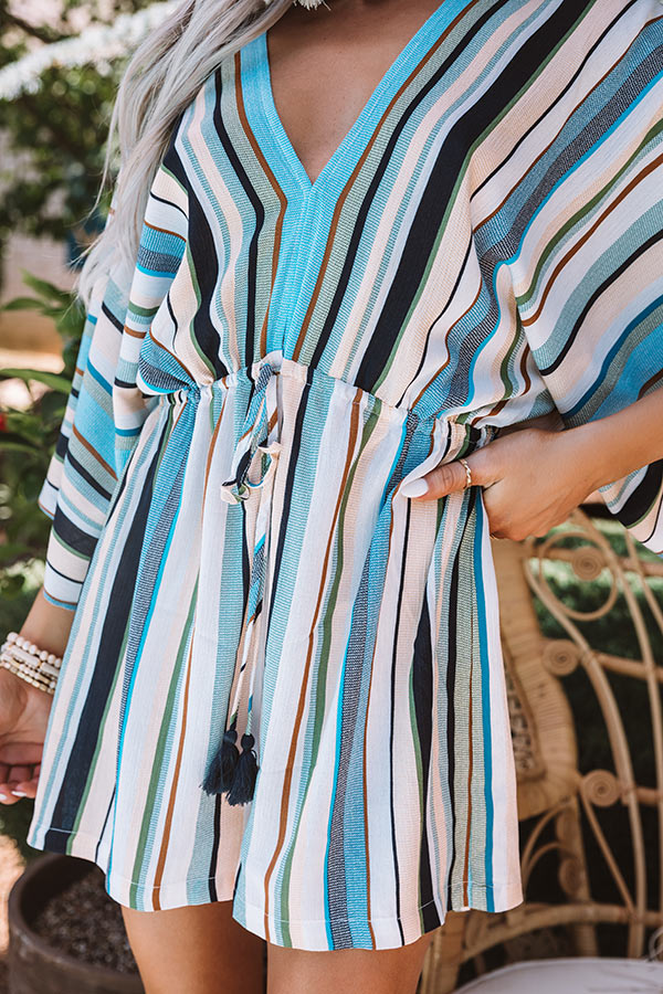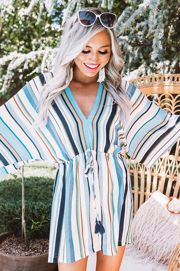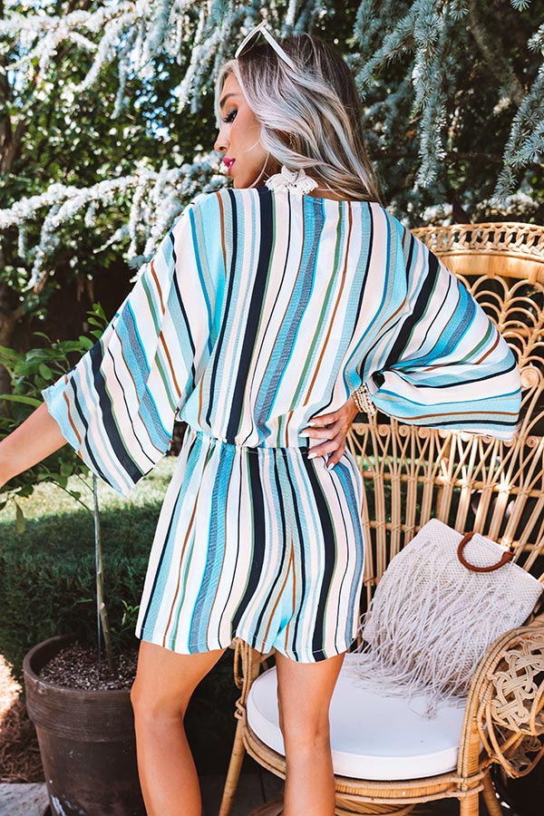 You are sure to look sassy in stripes when you wear this adorable romper featuring lightweight breezy material patterned with vertical blue hued accent stripes, a deep v-cut neckline, oversized 3/4-length bat wing sleeves, a cinched waistline with a tie belt, and a relaxed shorts silhouette that falls into straight upper-thigh length hemlines! We have styled this summer essential with some neutral wedges, sunnies, statement earrings, and a woven tote, but you can also wear it with "The Portia Faux Leather Peep Toe Bootie in Camel!" Measurements