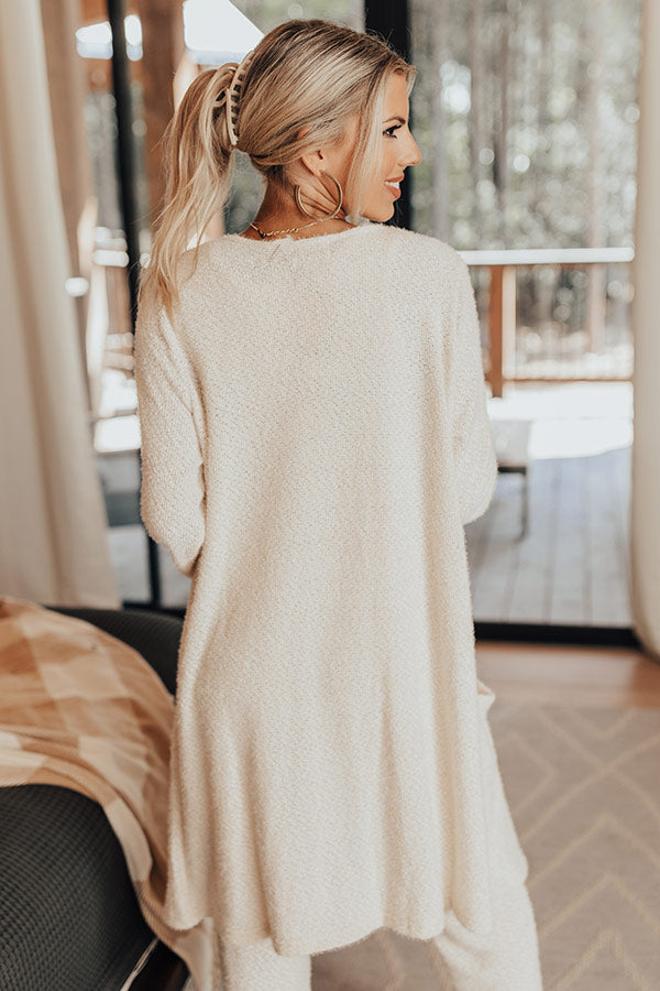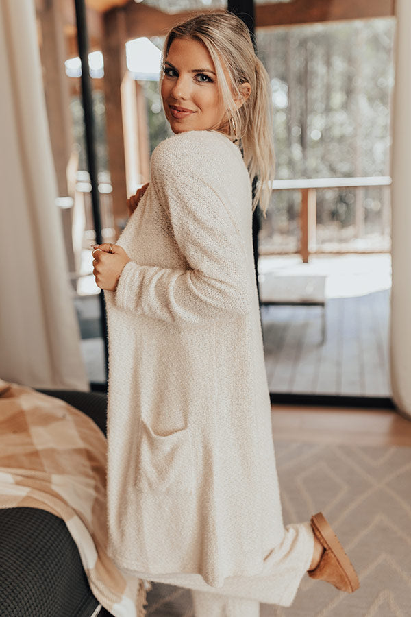 Spend your weekends in comfort with our charming cream colored 'Saturday Dreams' cardigan featuring soft and warm knit material, long loose sleeves, two low pockets, and a draped open front silhouette that cascades into a straight knee-length hemline! Measurements
