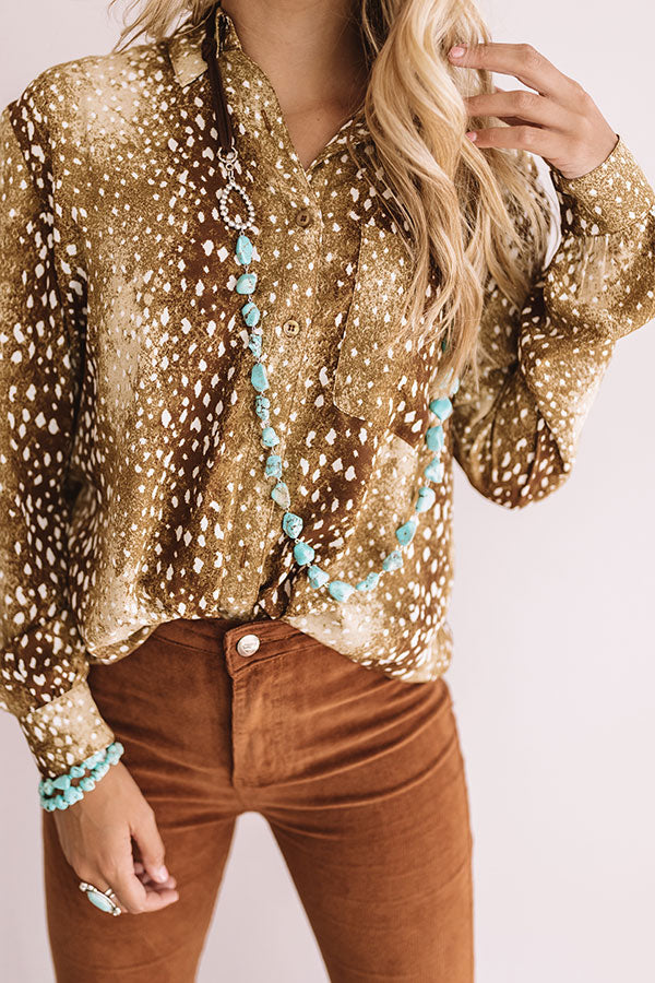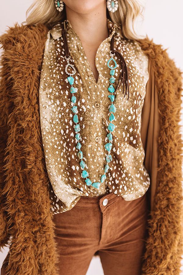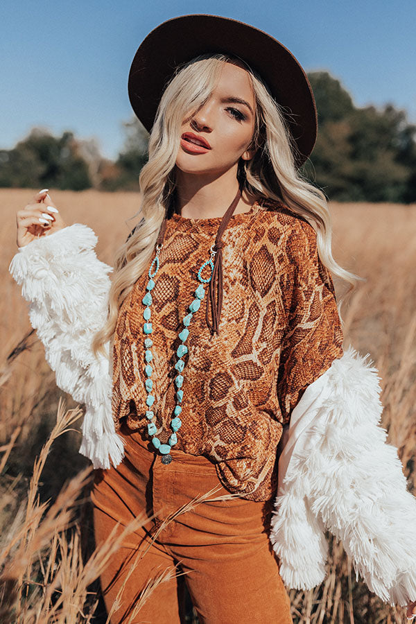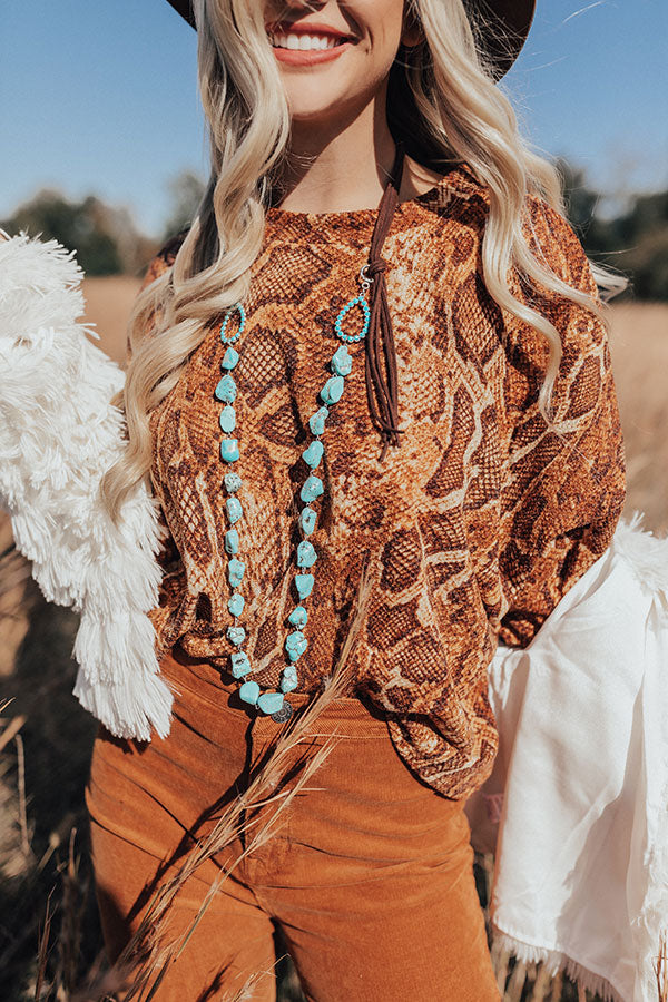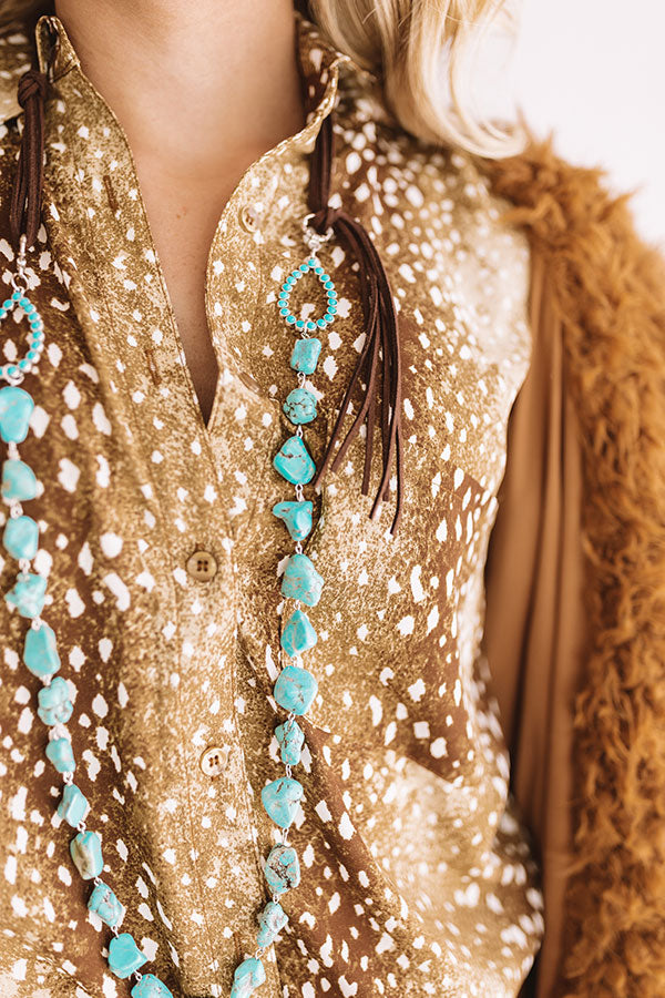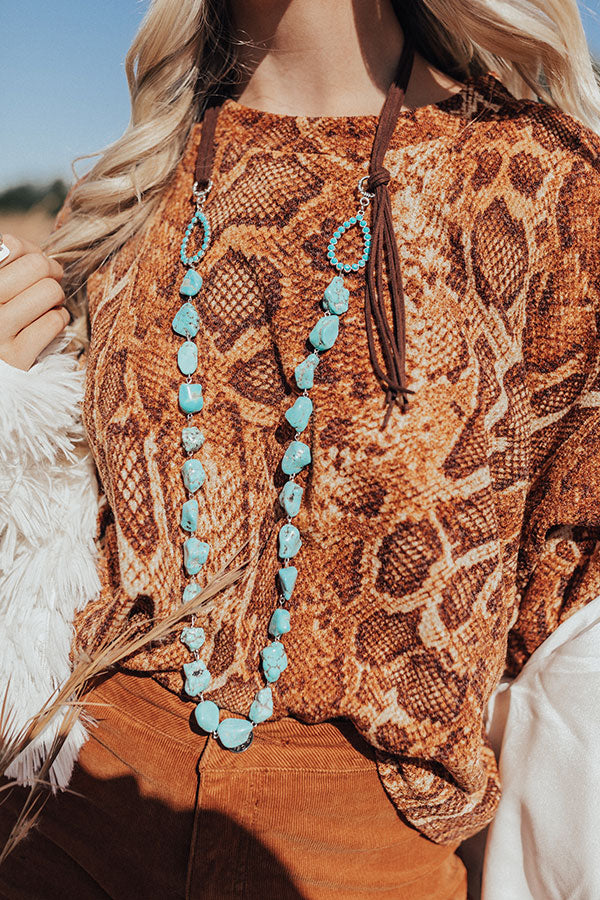 Spend your "Saturday sippin'" wine and drippin' in style when you accessorize with this statement necklace featuring large turquoise stones connected to knotted brown faux leather straps!
