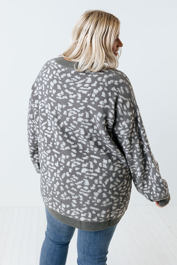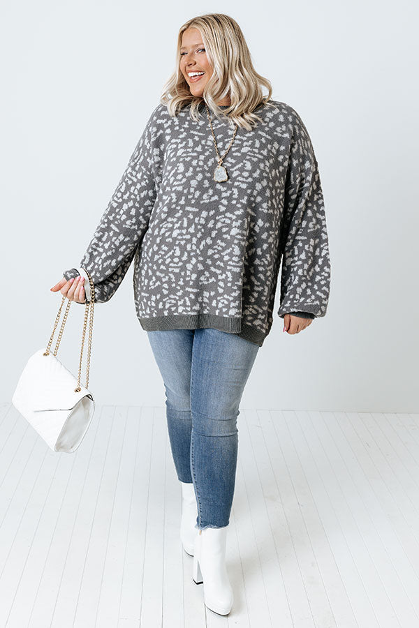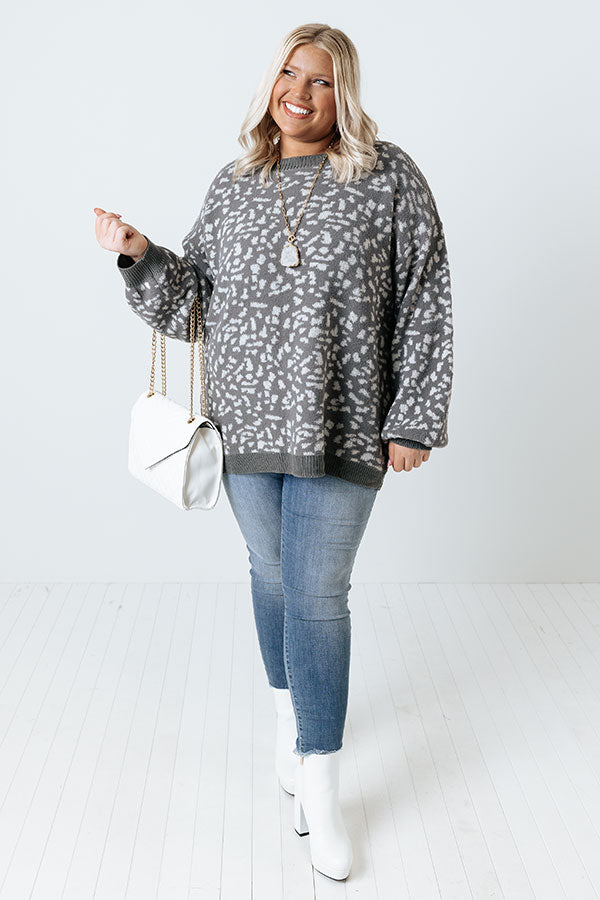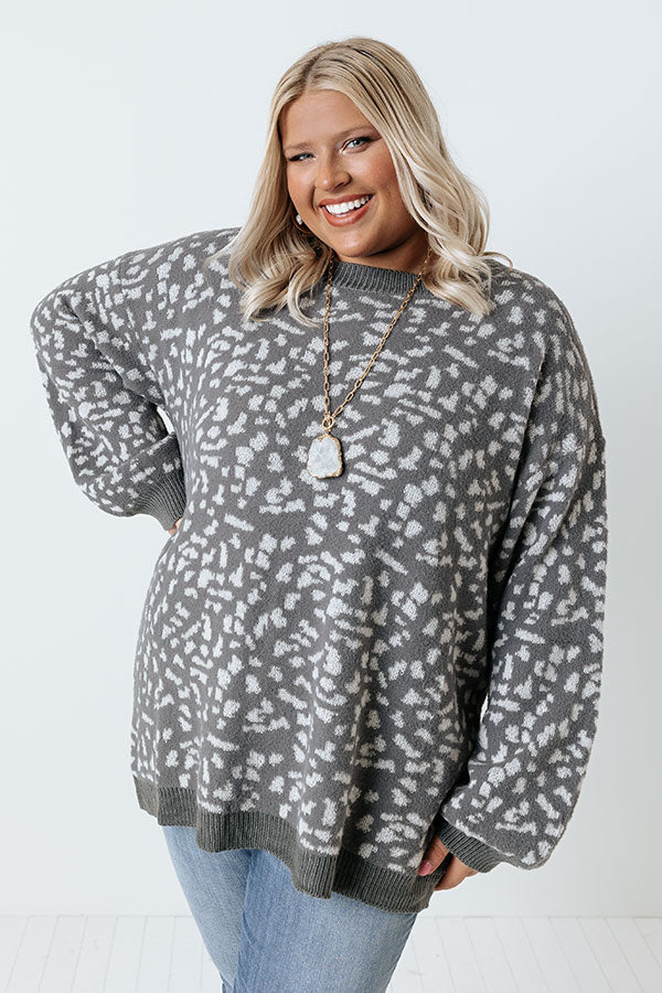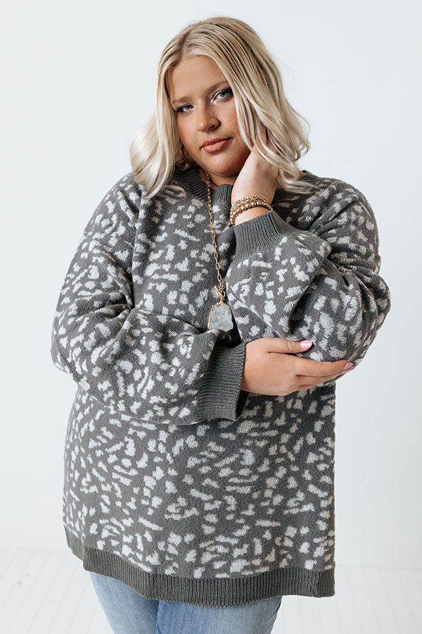 Let your winter wardrobe run wild with our adorable grey plus size 'Savannah Snow' sweater featuring soft knit material patterned with a white leopard print, a rounded neckline, long loose sleeves, and a slouched silhouette that falls into a straight hemline!