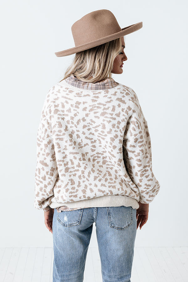 Let your winter wardrobe run wild with our adorable ivory colored 'Savannah Snow' sweater featuring soft knit material patterned with a natural hued leopard print, a rounded neckline, long loose sleeves, and a slouched silhouette that falls into a straight hemline!