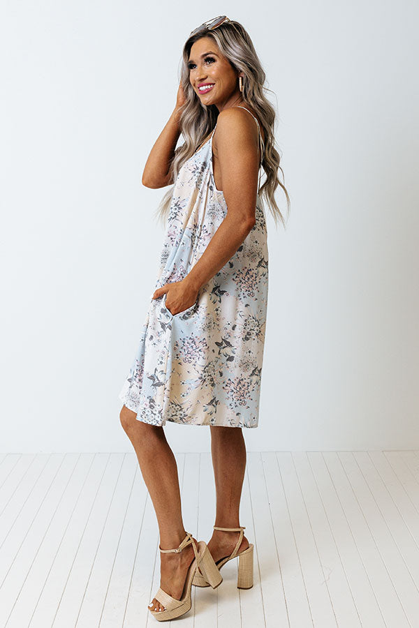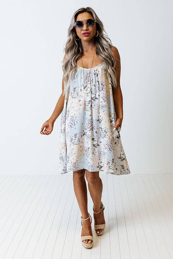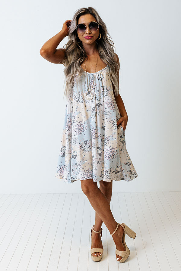 Our beautiful 'Savor The Sunshine' shift dress features lightweight material patterned with a light blue, white, and pale yellow hued floral print, a scooped neckline, spaghettis traps that cross in the back, hidden side pockets, and a relaxed silhouette that falls into a straight mid-thigh length hemline!