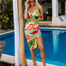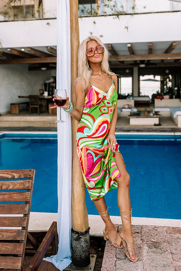 - Lightweight, kelly green colored satin material with a colorful abstract pattern