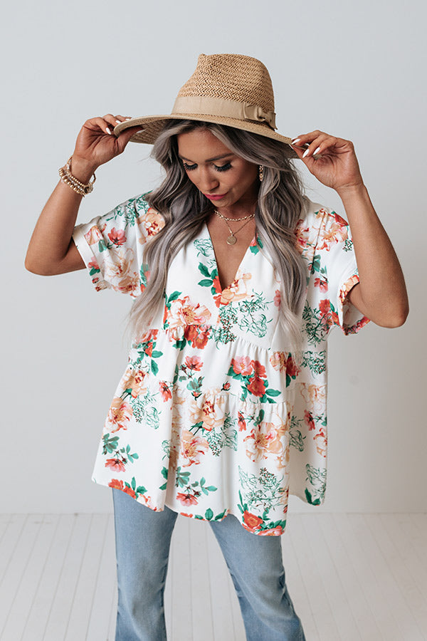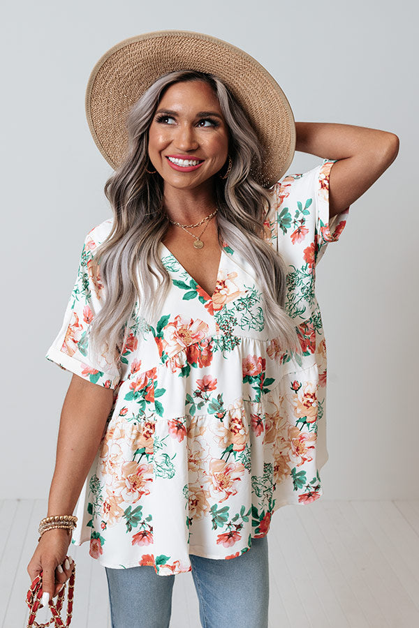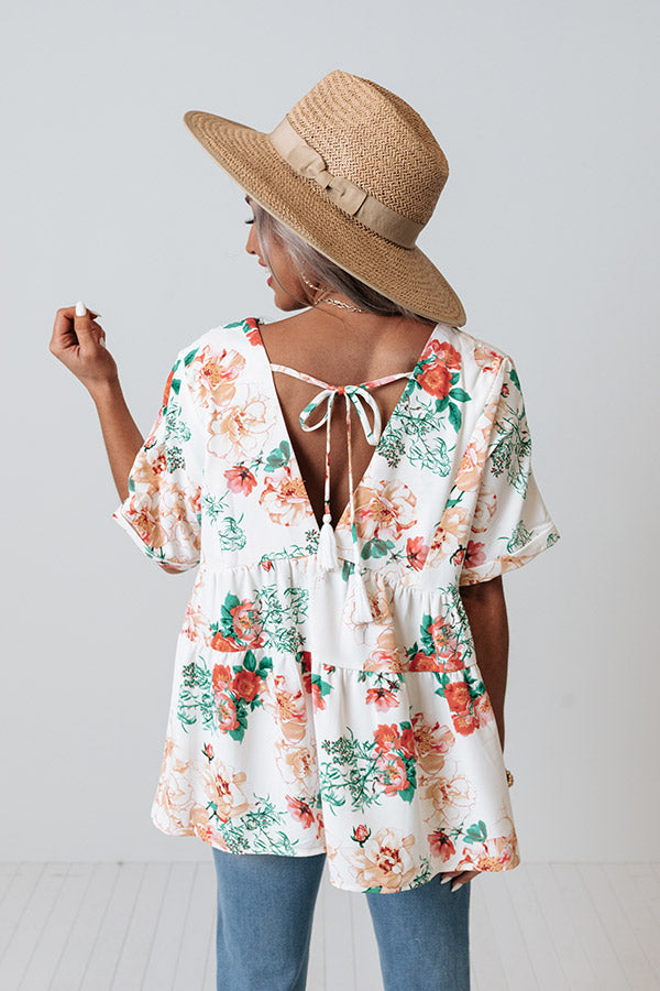 Complete your OOTD with this sweet white top featuring lightweight material patterned with a bold green and coral hued floral print, a v-cut neckline and upper back with a tie closure, flowy short sleeves with rolled cuffs, and a relaxed tiered babydoll silhouette that falls into an uneven hemline! Measurements