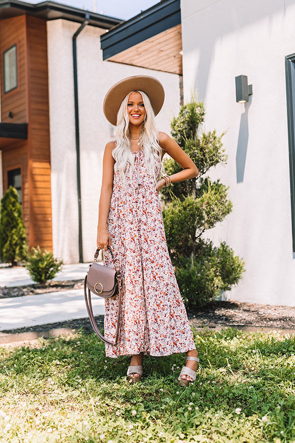 People are guaranteed to sweetly inquire where you got this beautiful iced latte colored midi dress featuring lightweight flowy material patterned with a orange, blue, and orchid hued floral print, a straight neckline with a tie closure, adjustable spaghetti straps, and a relaxed silhouette that cascades into a straight ankle-length hemline! Measurements