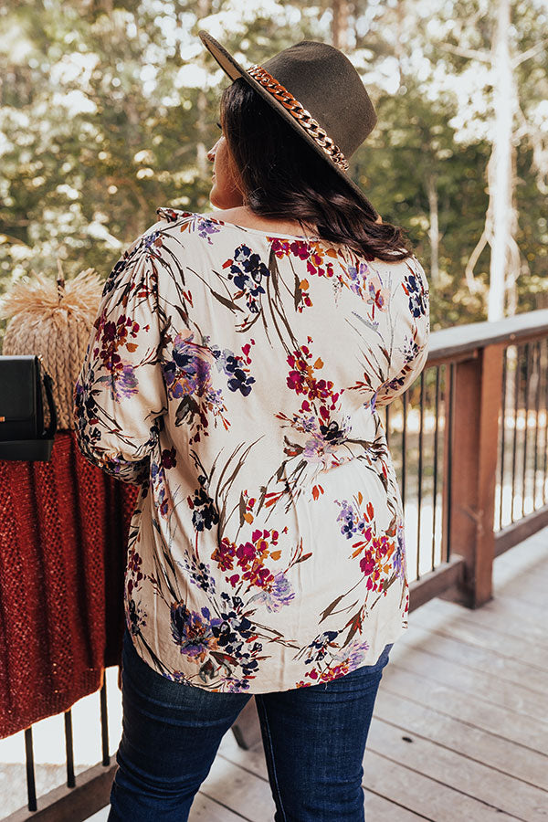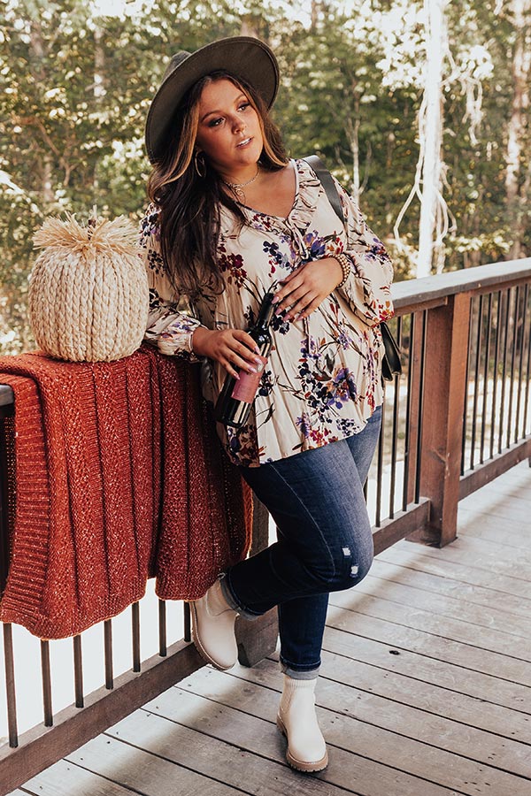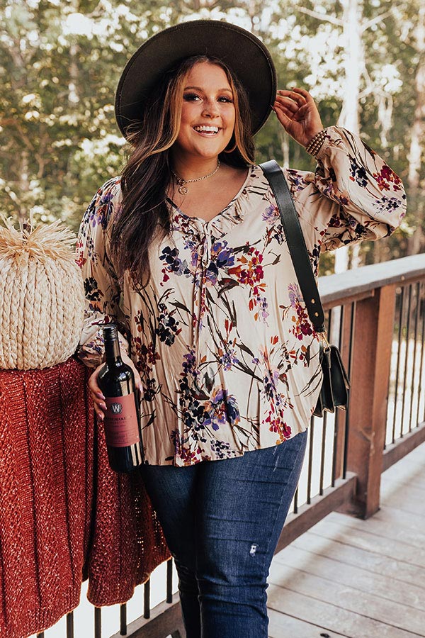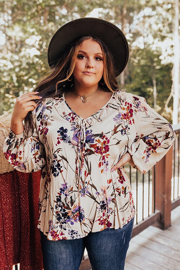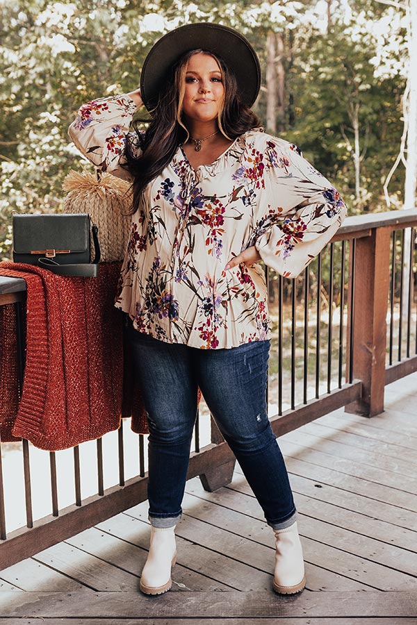 People are guaranteed to say something sweet about your OOTD when you complete your look with this darling plus size white shift top featuring lightweight flowy material patterned with a colorful floral print, a v-cut neckine with a tie closure and ruffle trim detailing, long loose sleeves, and a relaxed silhouette that falls into a rounded hemline! Measurements