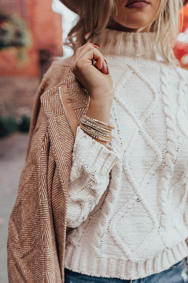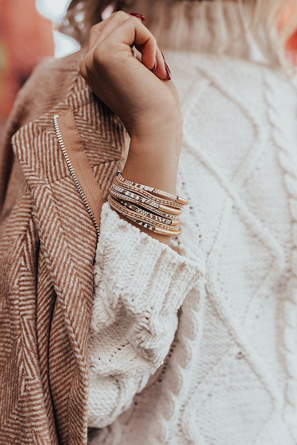 We guarantee that you will want to "scoop up" this statement bracelet featuring seven gold faux leather bands with silver accents and a magnetic closure!