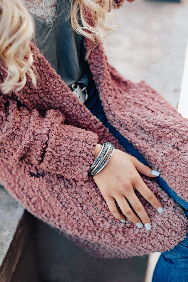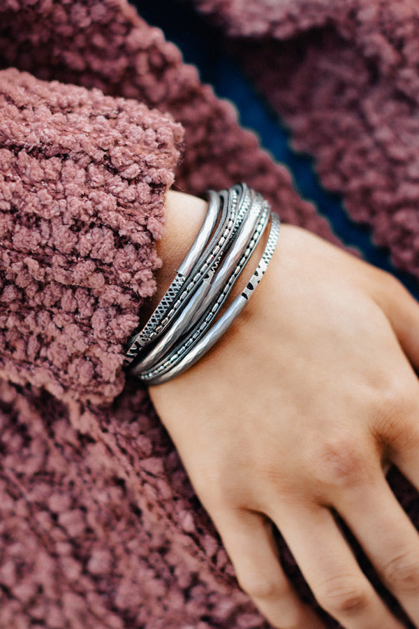 We guarantee that you will want to "scoop up" this statement bracelet featuring seven silver faux leather bands with metal accents and a magnetic closure!