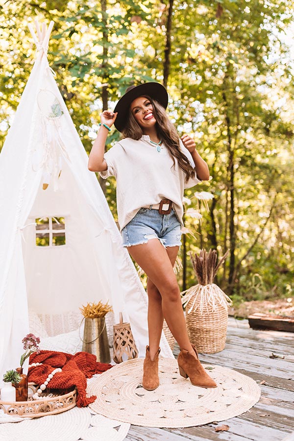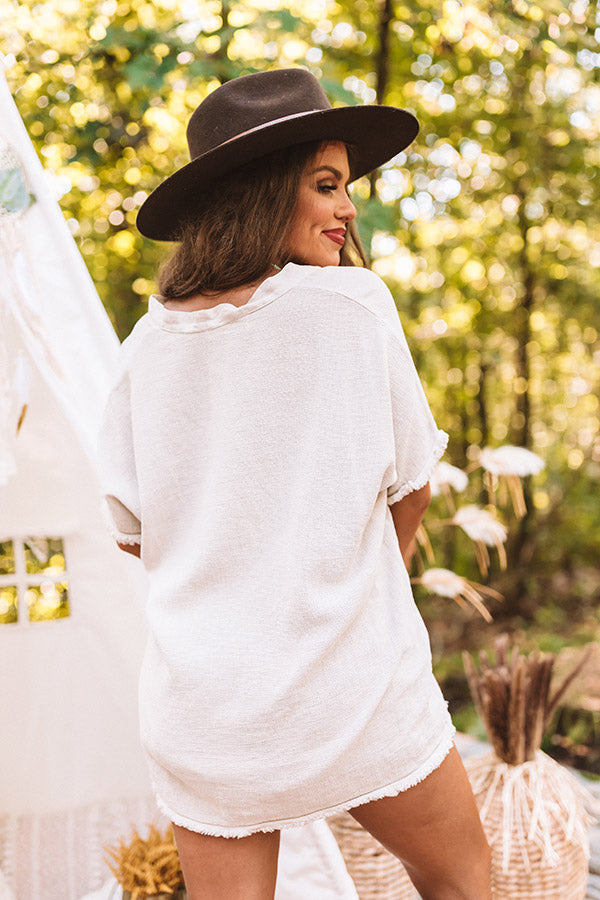 Welcome summer in style with our casual birch colored "Sea Breeze" top featuring soft lightweight linen material with subtle texturing, a button up bodice with a collared neckline, short loose sleeves, frayed raw cut trim detailing, and a relaxed silhouette that falls into a straight hemline! This darling piece can be worn a variety of ways, like with some distressed denim shorts, brown booties, a matching wool hat, and a statement belt, but you can also pair it with some frayed black skinnies, "The Wynn Wedge in Birch," and our "New On The Block Faux Leather Fringe Tote in Birch!"