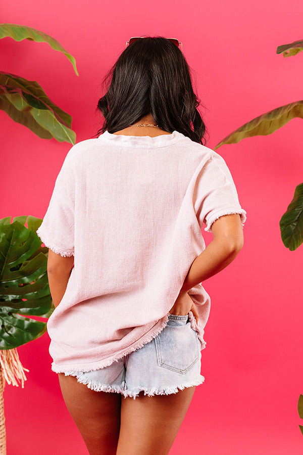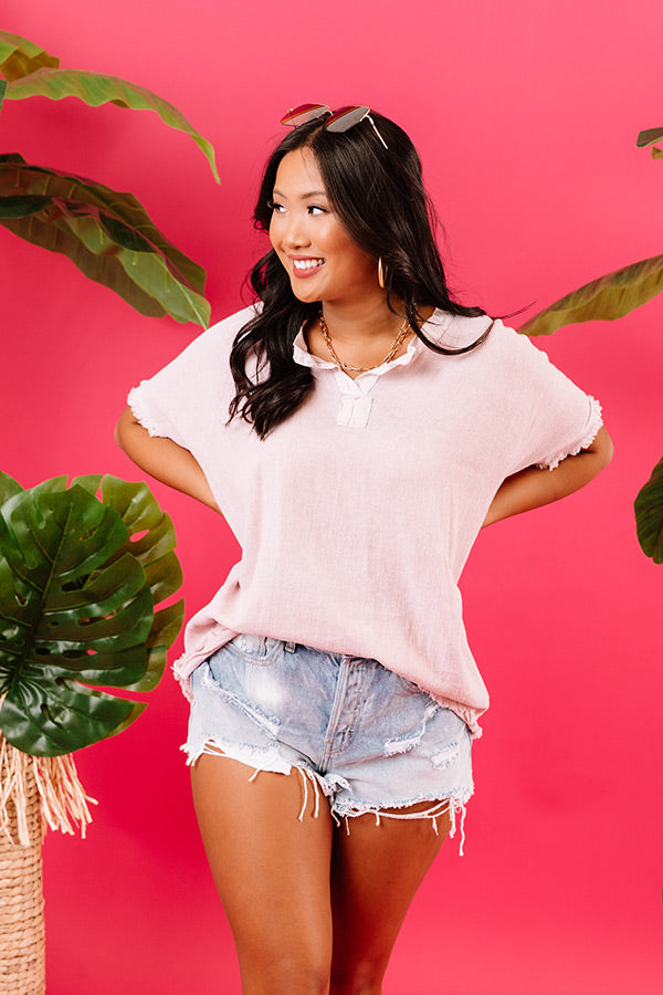 Welcome summer in style with our casual blush 'Sea Breeze' top featuring soft lightweight linen material with subtle texturing, a button up bodice with a collared neckline, short loose sleeves, frayed raw cut trim detailing, and a relaxed silhouette that falls into a straight hemline! Measurements