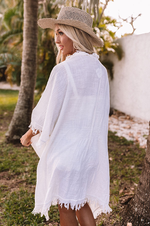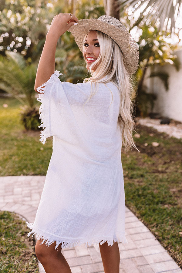 Drape yourself in style with our darling white 'Sea Dive' overlay featuring ultra lightweight and breezy linen-like material, oversized 3/4-length sleeves, fringe trim detailing, and a relaxed open front silhouette that cascades into a straight knee-length hemline with accent side slits! Measurements