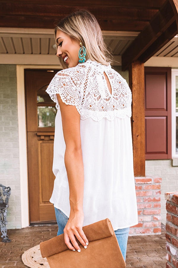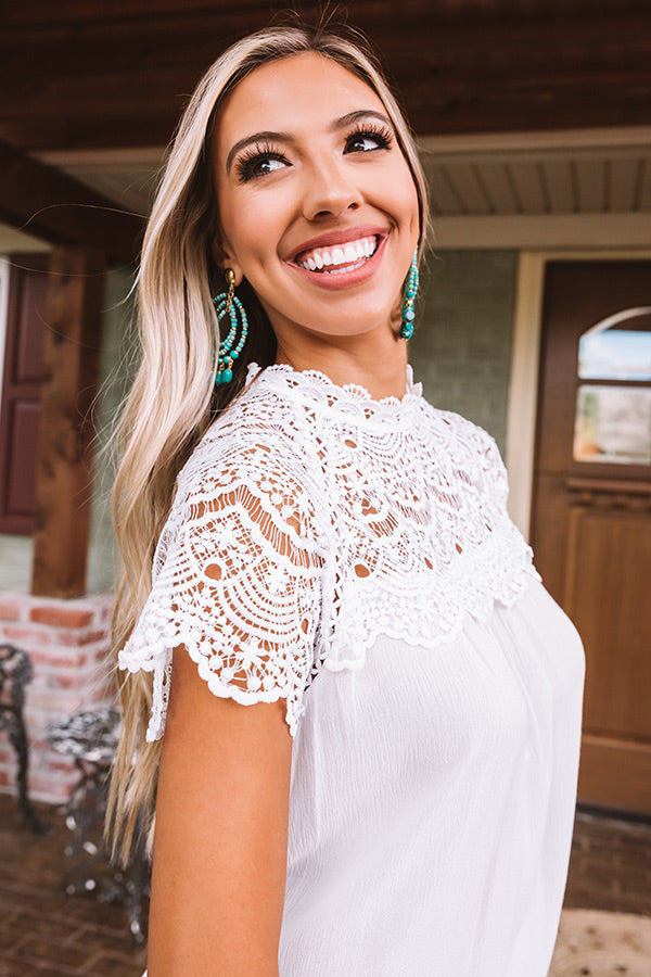 Achieve effortless style with our elegant white "Sea Serenity" top featuring lightweight breezy material with intricate semi-sheer crochet detailing across the shoulders, a high neckline, short loose sleeves with scalloped trim, a keyhole accented upper back with a button closure, and a relaxed silhouette that falls into a rounded hemline! We have paired this charming piece with some distressed ankle skinnies and a brown mule heel and faux suede clutch, but you can also wear it with "The Violet Midrise Shorts in Olive," our "Giving Grace Floral Hair Scarf in Honey," and "The Alaya Wedge in Golden Honey!" Measurements