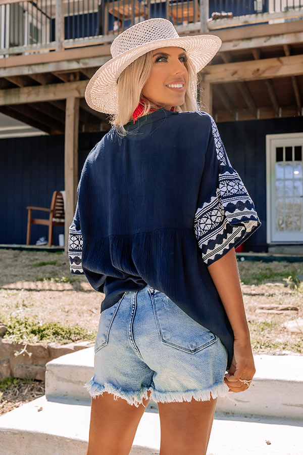 Compliment's are sure to fly your way when you arrive in our pretty navy 'Sea Twirls' shift top featuring lightweight material with intricate white embroidered detailing, a v-cut neckline, oversized half sleeves, and a relaxed silhouette that falls into a straight hemline! on products