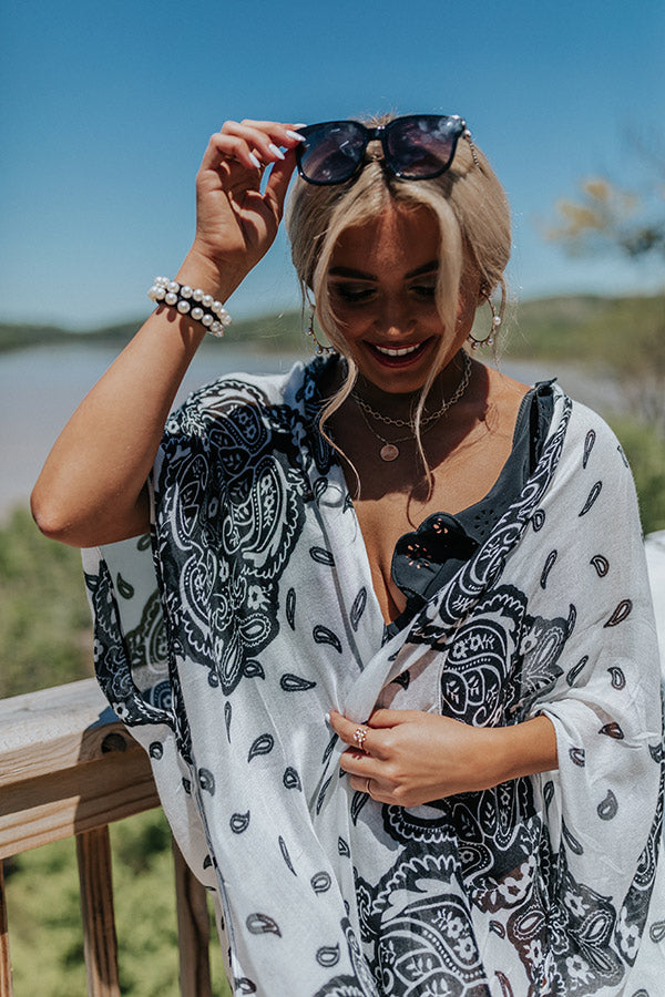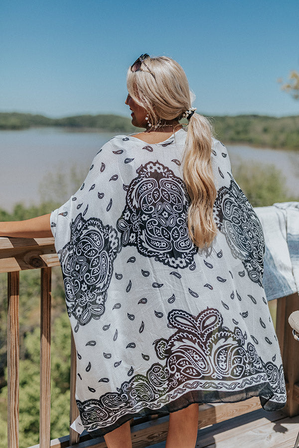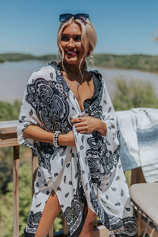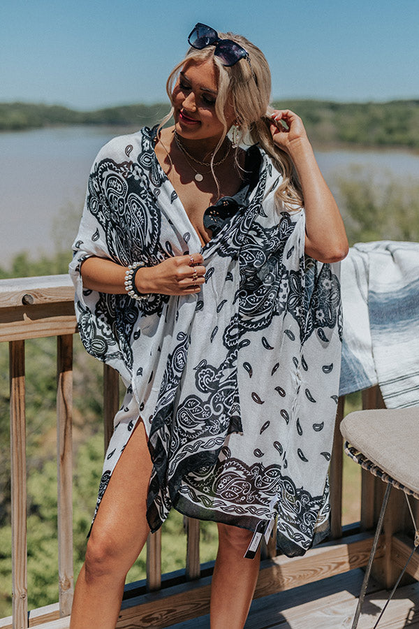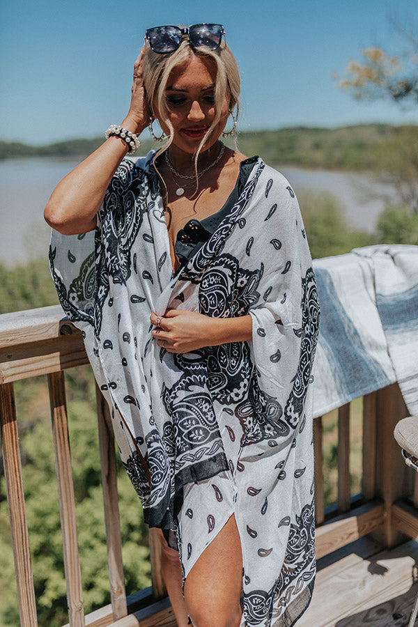 You are guaranteed to look chic this summer when you wear this adorable white overlay featuring lightweight breezy material patterned with a black paisley print, oversized half sleeves, and an ultra draped open front silhouette that cascades into a straight knee-length hemline with accent side slits!