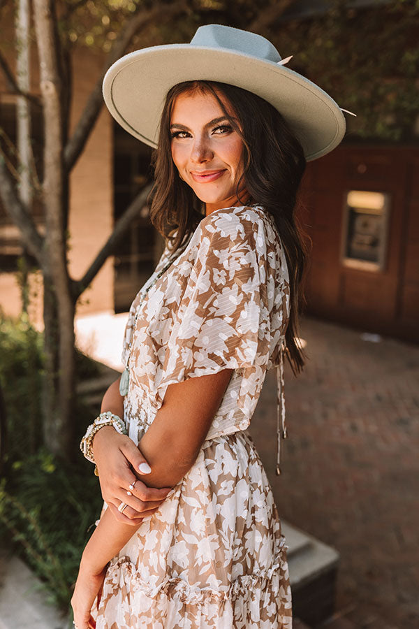 Show up and show out in our adorable light brown 'Seafront Views' dress featuring lightweight material patterned with a white floral print, a deep v-cut neckline, loos short sleeves, and a relaxed babydoll silhouette that falls into a subtly ruffled mid-thigh length hemline!