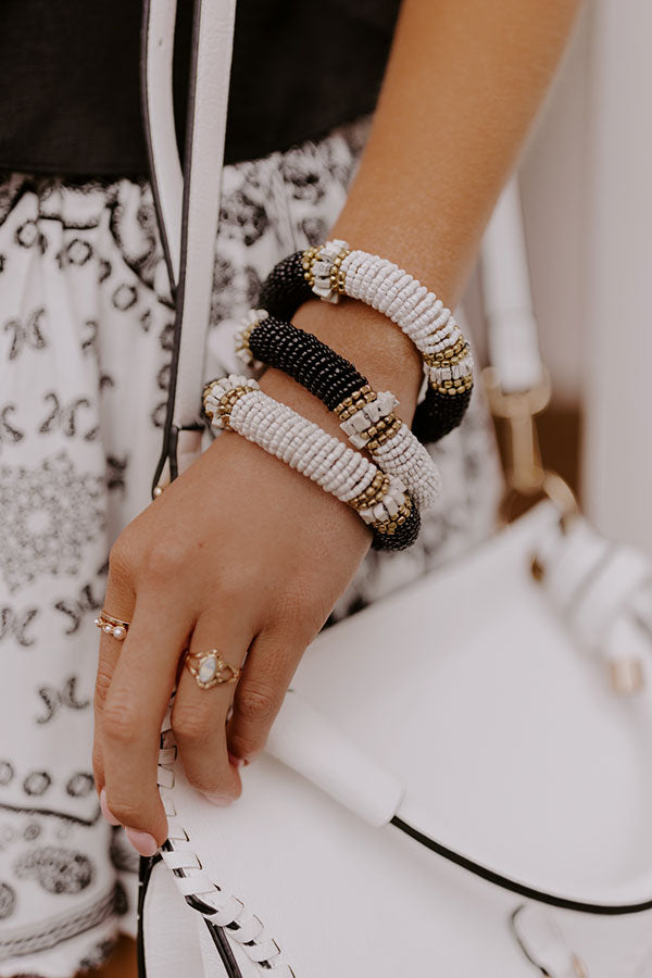 Your arm candy stack is sure to catch someone's eye when you complete it with our stunning 'Seas The Moment' bracelet featuring a large black and white beaded stretch silhouette!
