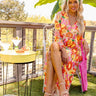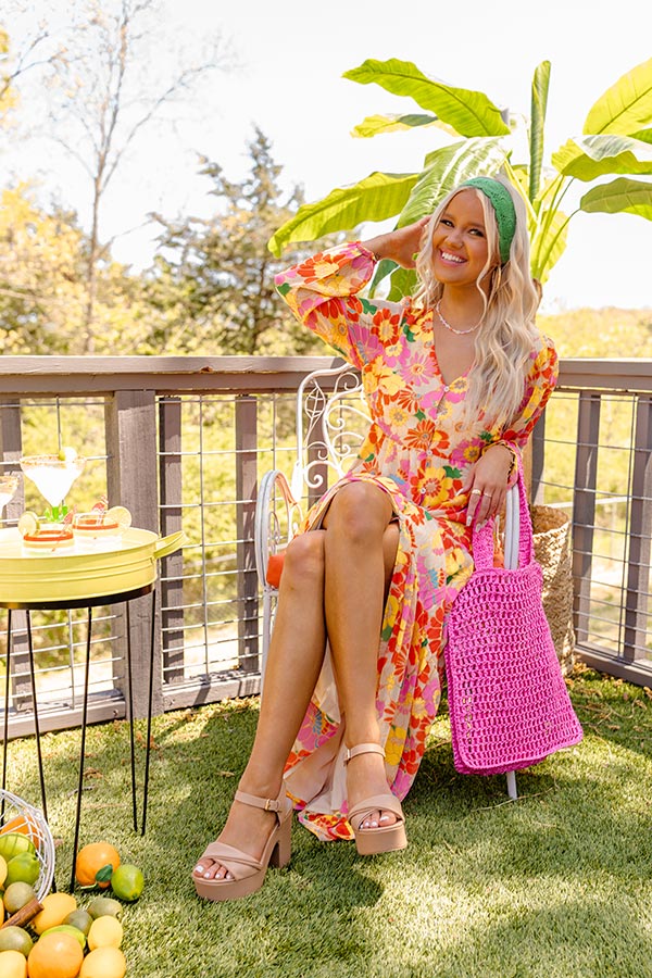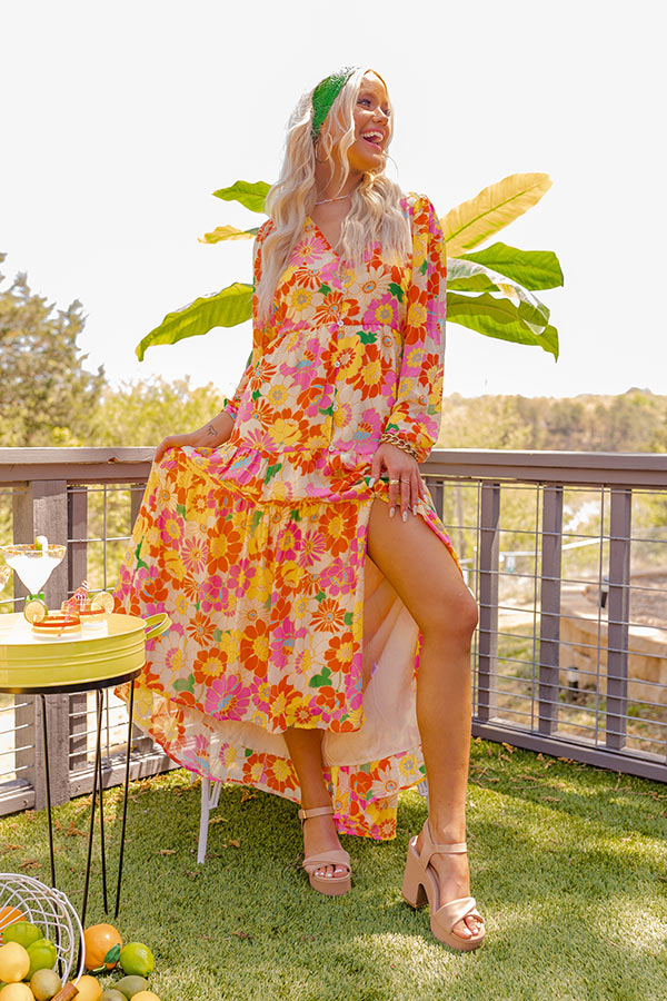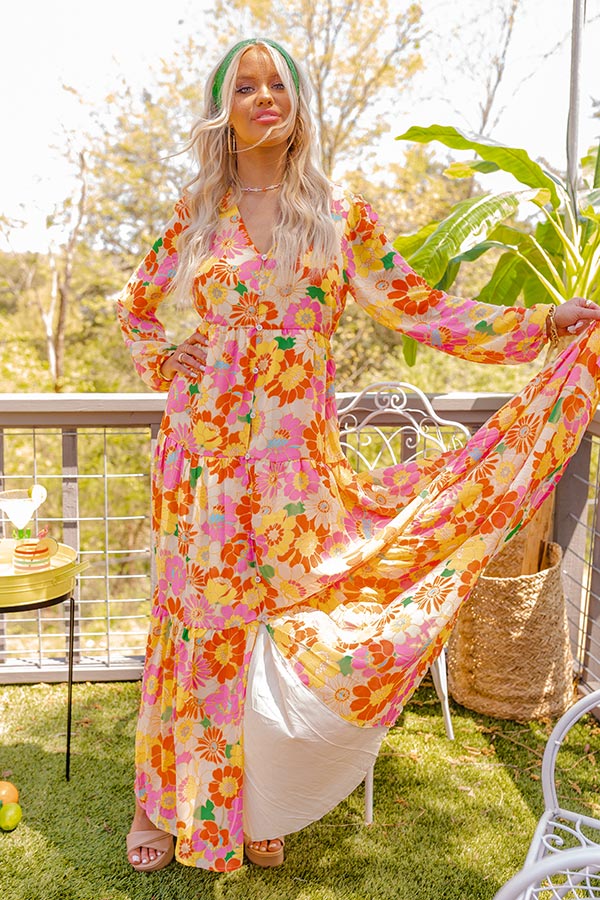 Get dressed to impress in our pretty tangerine colored 'Seas The Moment Maxi' featuring lightweight material patterned with a yellow, pink, and green floral print, a button up front with a v-cut neckline, long loose sleeves, and a relaxed silhouette that cascades into a straight ankle-length hemline!