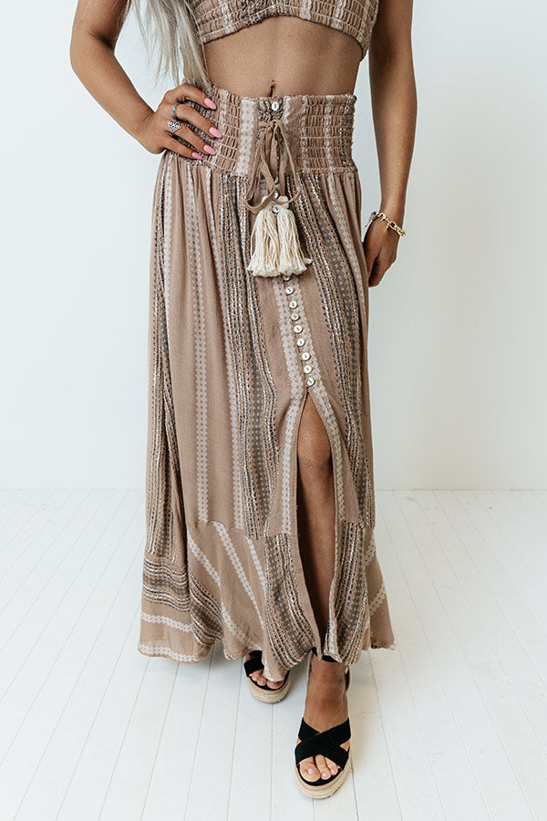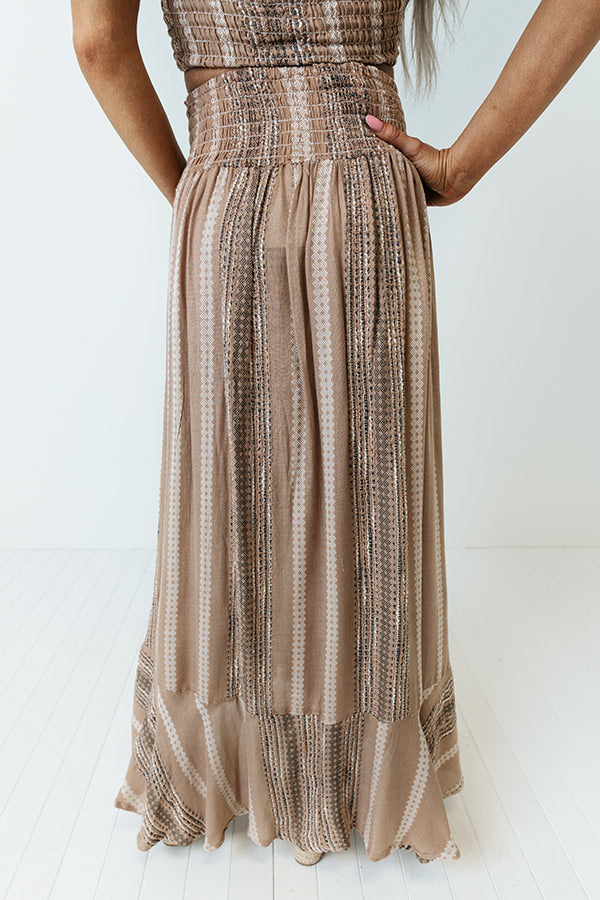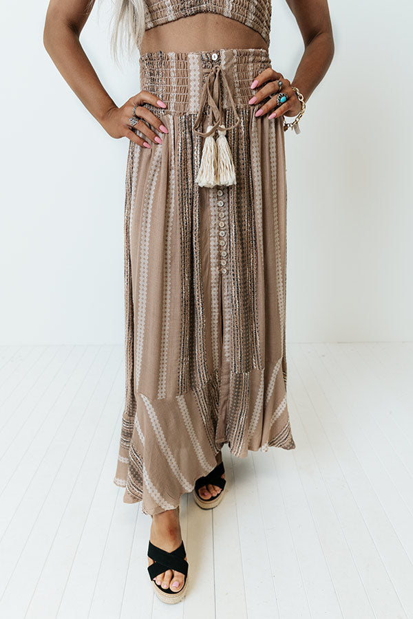 Take on all your summer adventures in style with this trendy tan hued midi skirt featuring lightweight smocked material patterned with vertical black and cream accent stripes, an ultra high and wide smocked waistline with a tassel tie accent, and a breezy silhouette that falls into a ruffled mid-calf length hemline with an accent side slit!