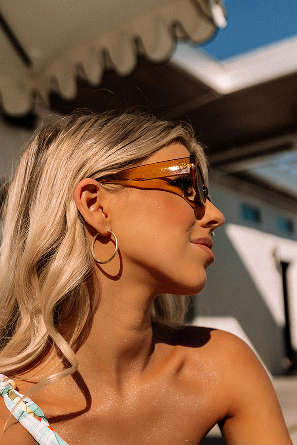 Take on your summer seaside adventures in style with these trendy sunnies featuring rectangular mustard hued frames and dark tinted lenses!