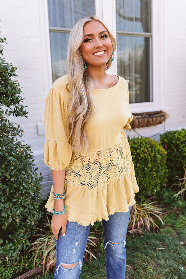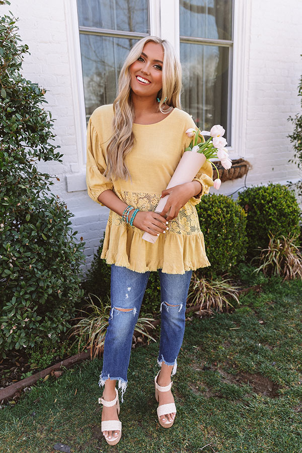 Create your own sunshine in our adorable yellow "Seaside Condo" top featuring lightweight breezy material, a wide scooped neckline, loose 3/4-length bubble sleeves with fitted elastic banded cuffs, intricate semi-sheer crochet flower detailing, a keyhole accented upper back with a tie closure, and an ultra relaxed silhouette that falls into a peplum bottom with an frayed uneven tunic-length hemline! We have styled this cutie with some distressed skinnies and a white platform heel, but you can also wear it with some frayed white shorts, "The Charlotte Espadrille in Yellow," sunnies, and our "Chic Aspirations Transparent Crossbody in White!"