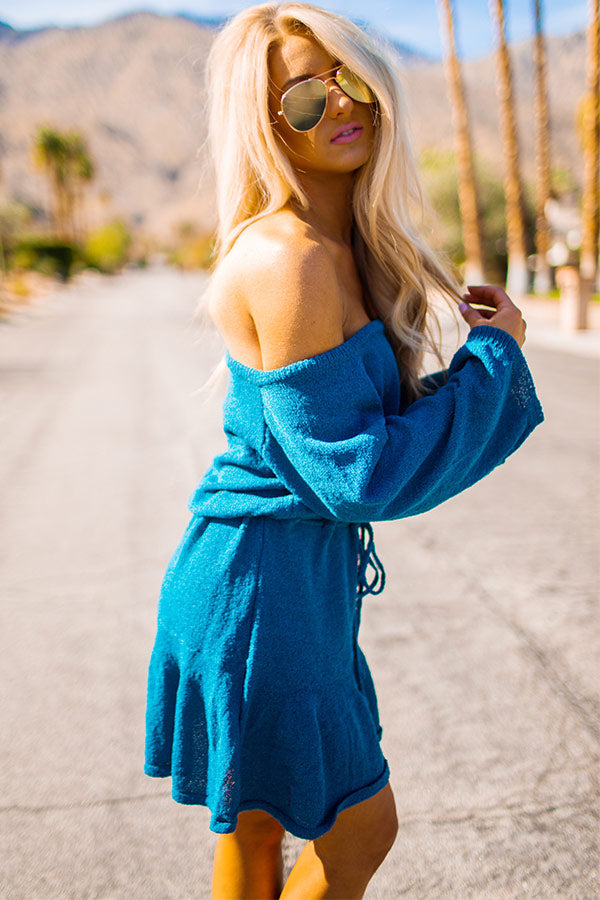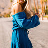 This lightweight teal knit off-the-shoulder dress is as cozy as it is cute! It features quarter-length bell sleeves, a relaxed scoop neckline (that can be worn off of one shoulder), a tie waistline & a flirty ruffled bottom hem. Rain or shine... This transitional dress is the perfect fit!