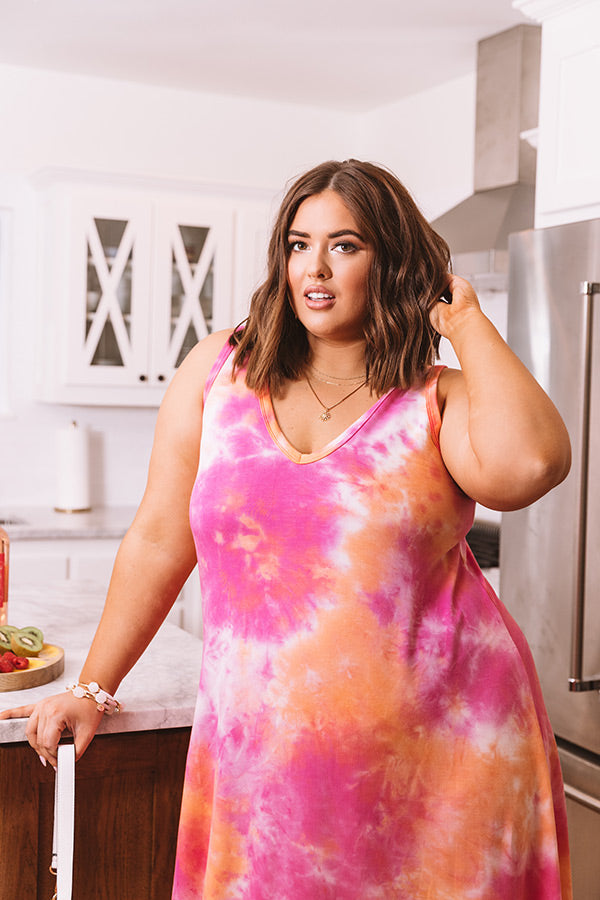 Plus Size - You are sure to turn heads anywhere you go in our stunning "Seaside Memories" midi dress featuring soft lightweight material patterned with hot pink and orange hued tie dye, a v-cut neckline, wide 2-inch sleeveless shoulder straps, and a relaxed silhouette that falls into a rounded mid-calf length hemline! We have styled this vibrant summer piece with a white mule heel and faux leather bucket bag, but you can also wear it with "The Roxana Lace Up Wedge in Hot Pink" and our matching "Mod About It Sunnies in Sunset!" Measurements