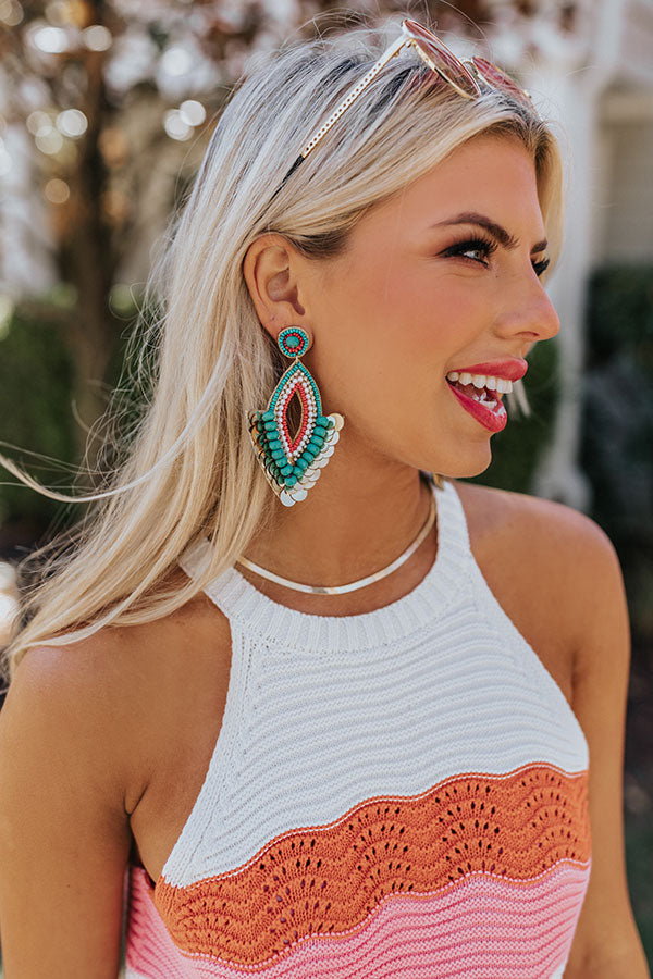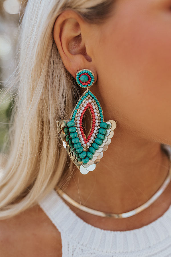 Watch those seaside sunsets in style with these gorgeous statement earrings featuring turquoise and wood beads, gold sequins, circle studs, and dangling oversized pointed oval silhouettes!