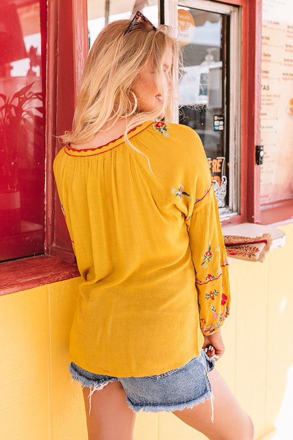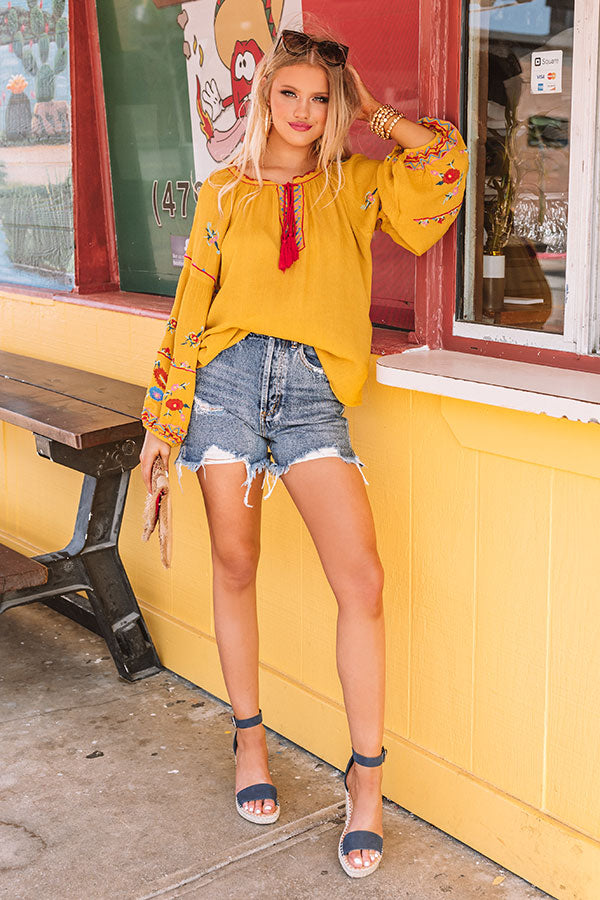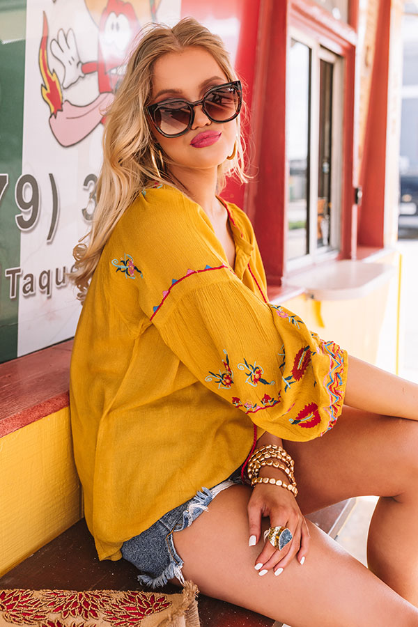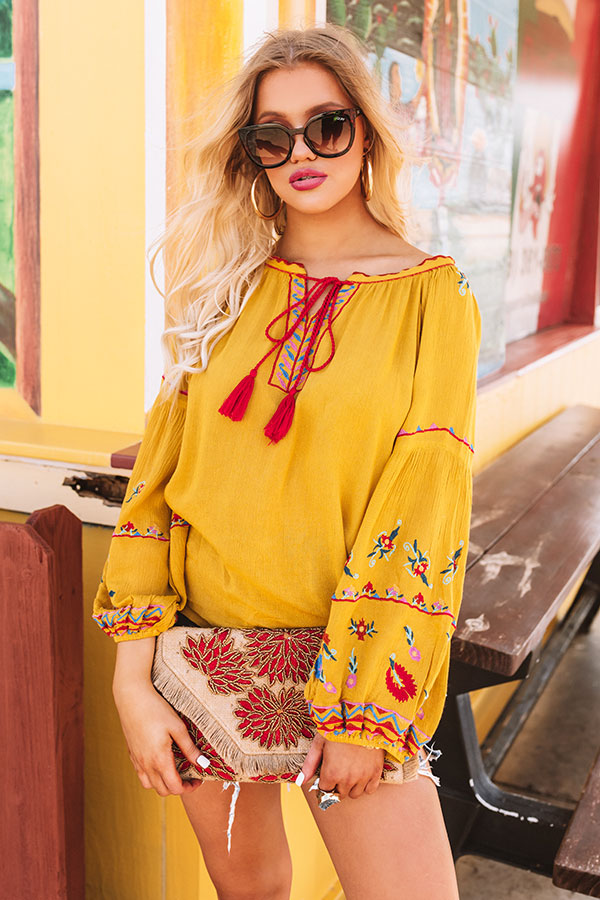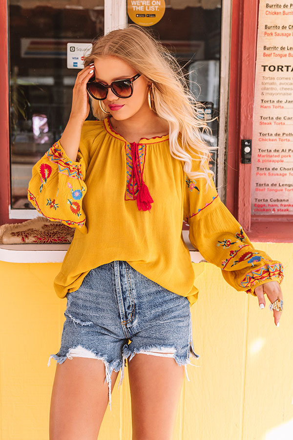 You are sure to look like a total "seaside sweetheart" when you wear this adorable mustard colored shift top featuring lightweight breezy material with intricate red, blue, and green floral embroidery, a rounded neckline with a tie closure and a v-notch accent, long bubble sleeves with fitted elastic banded cuffs, and a relaxed silhouette that falls into a rounded hemline! We have styled this summer cutie with some distressed denim shorts, sunnies, navy wedges, and a matching clutch, but you can also wear it with some frayed white skinnies, our "So Relatable Heel in Red," and our "Positano Party Beaded Earrings in Red!" Measurements