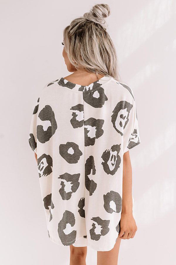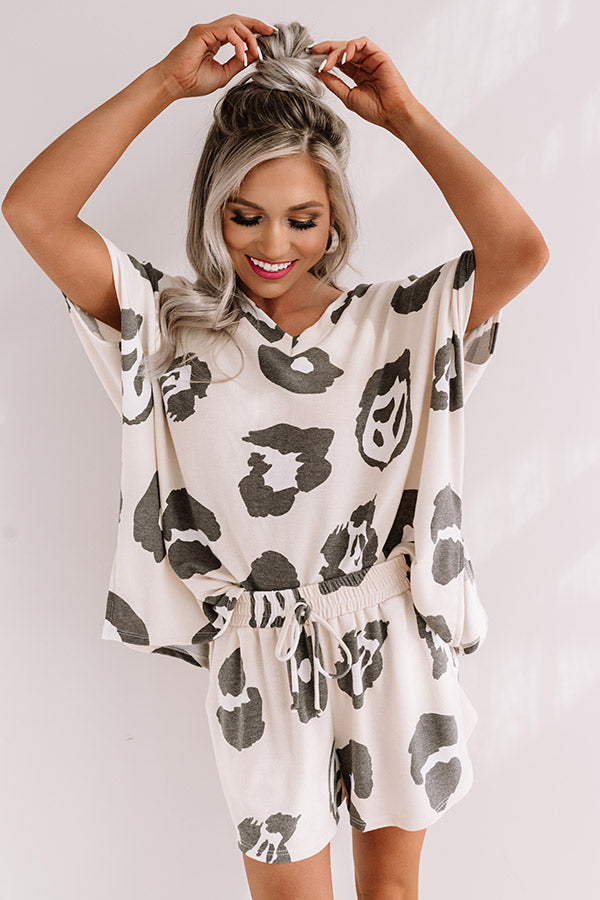 Nothing bring comfort to a gloomy day like a soft and comfy lounge piece like our adorable cream colored "Seaside Twist" shift top featuring soft lightweight material patterned with a large black and white leopard print, a wide v-cut neckline that can be worn off one shoulder, short loose sleeves, and an ultra relaxed silhouette that falls into a rounded hemline! All you have to do is style it with our "Seaside Twist Leopard Shorts in Cream" and add some fuzzy slippers for the ultimate cozy two piece look! Measurements
