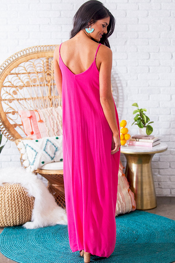 Look pretty in pink in the "Seaside Vacation Maxi!" This comfortably chic maxi dress has a sleeveless bodice with thin adjustable straps & an ultra relaxed rayon silhouette with hidden side pockets. Style this breezy babe with sandals by day, or a block heel by night... Your options are endless with this wear-anywhere maxi!