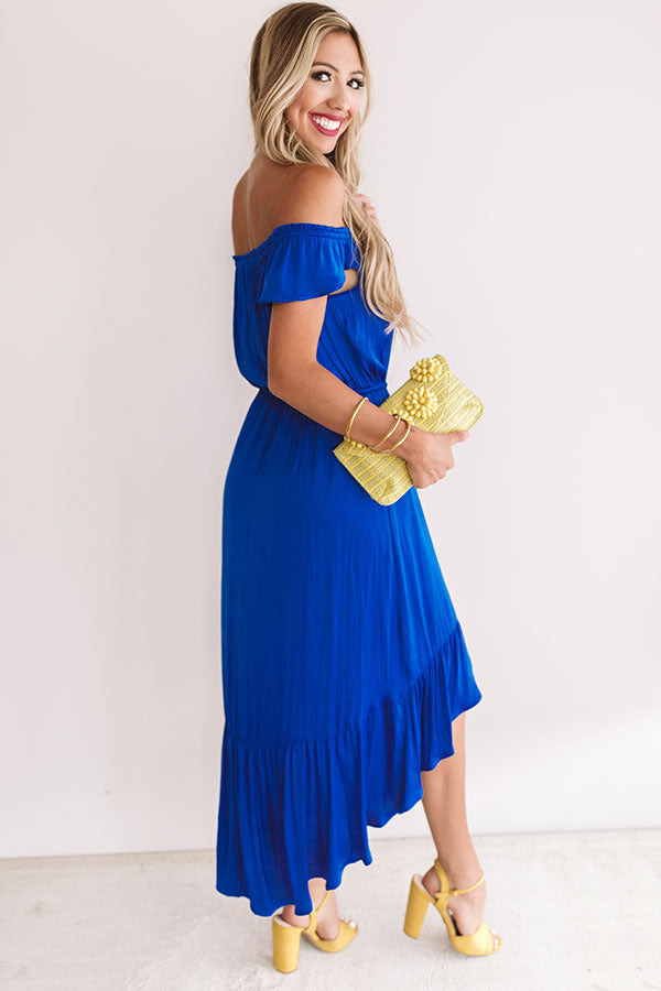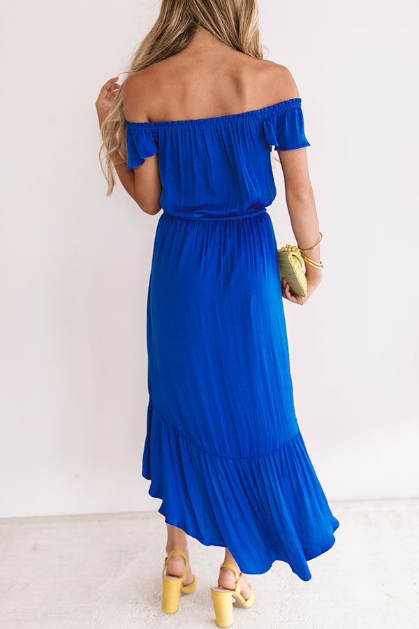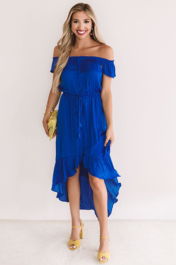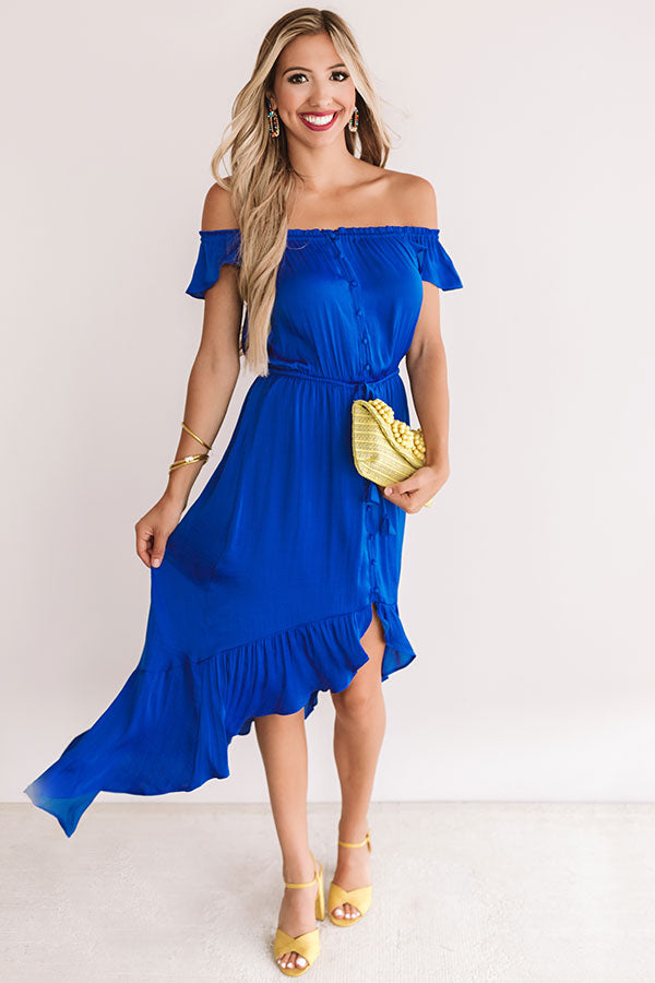 This royal blue dress is a piece you won't want to forget on your seaside vacay with its smocked off-shoulder fit, button up front, uneven ruffled hem, and elastic waistband with a belt tie! This daring piece styles beautifully with our "Swiss Sparkle Earrings" and "The Josie Wrap Up Heel" for an unforgettable summer outfit! Measurements